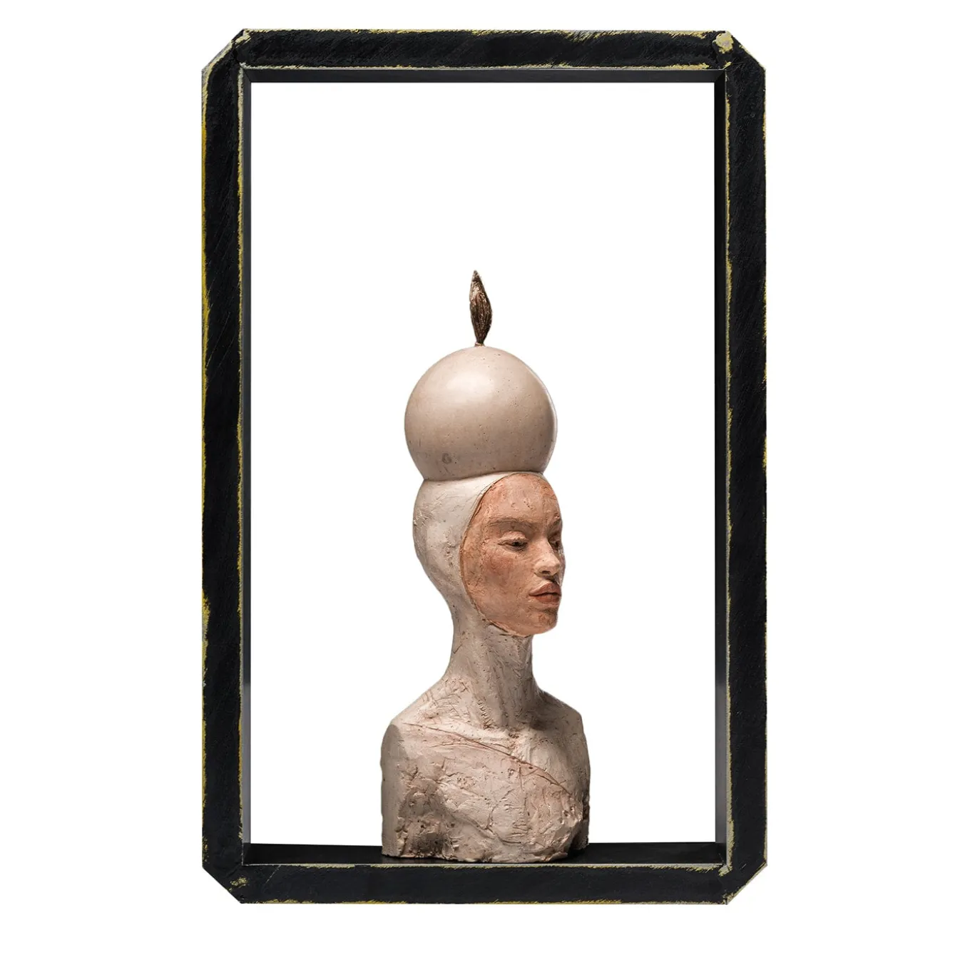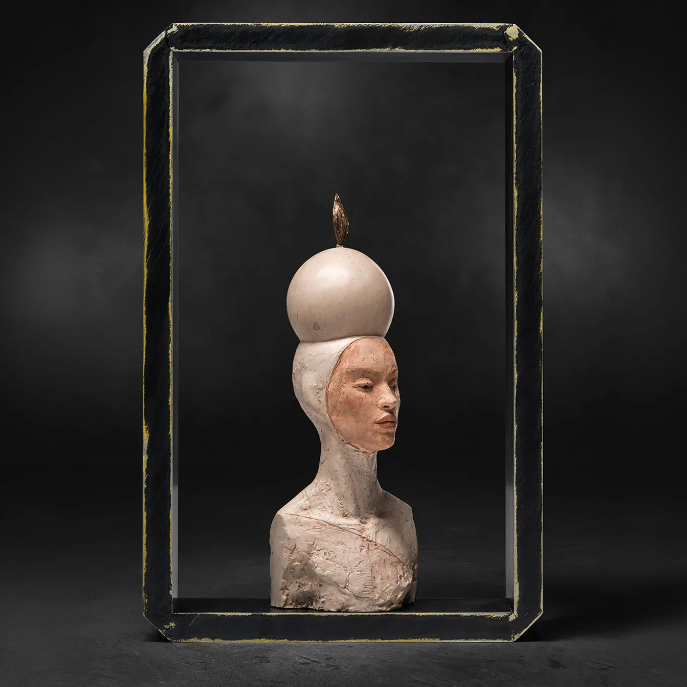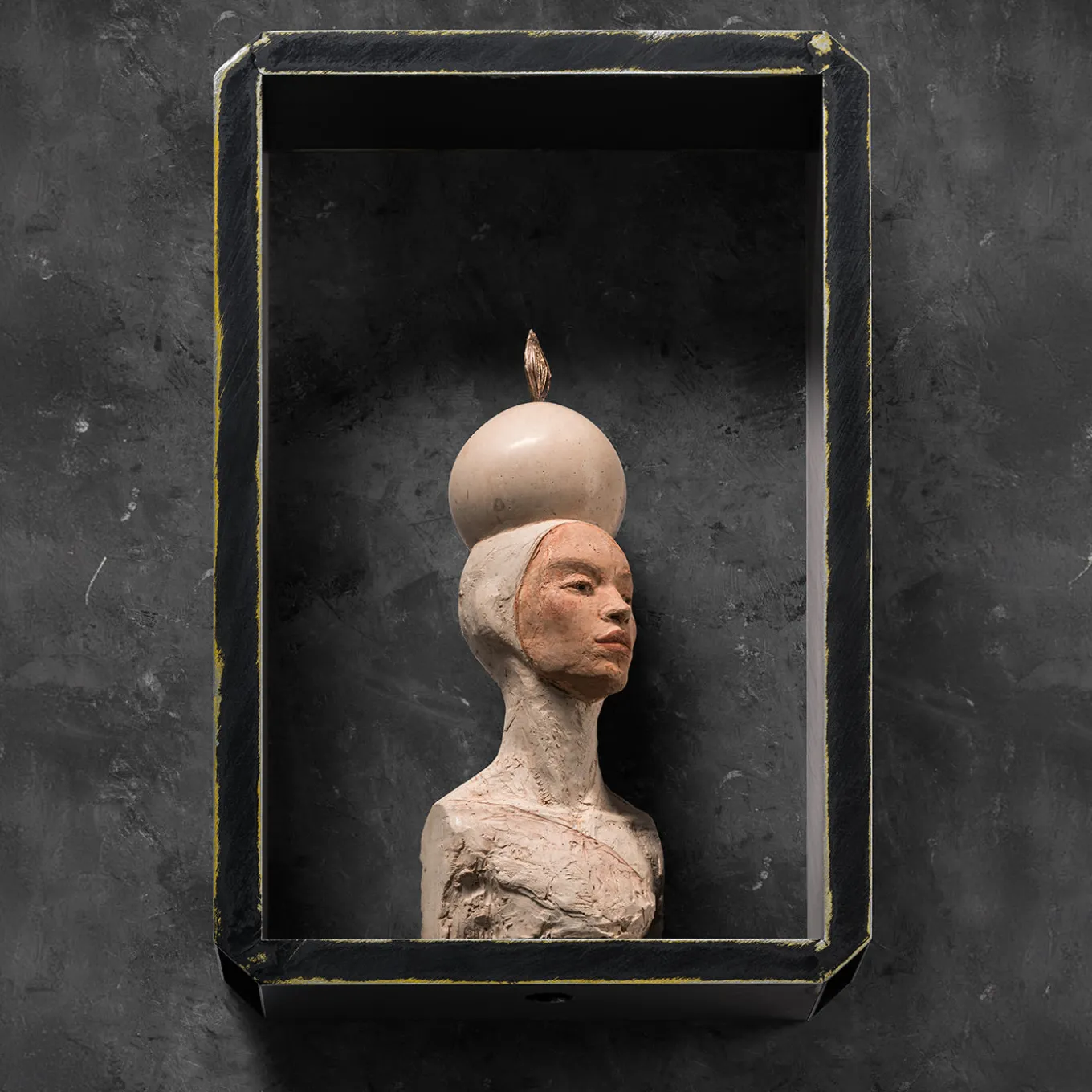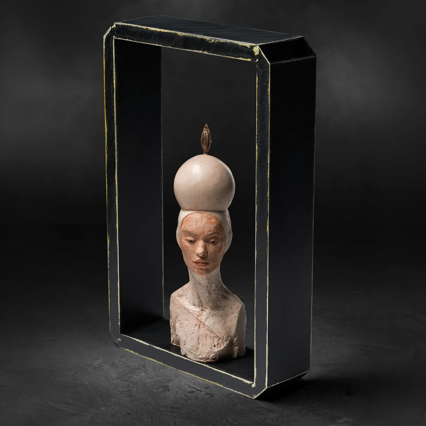 “L’Altare della Papessa” serves as a focal point for exploring themes of equality, women’s empowerment, and redefining roles in contemporary society. This unique piece, made from a blend of pigments and oxides, combines bronze elements with non-toxic hydroresin and rice husk. The vulva symbol on the headdress is bronze, created through lost-wax casting. Suitable for any environment, it can be wall-mounted or placed on a surface. The one-of-a-kind piece includes an aluminum frame.