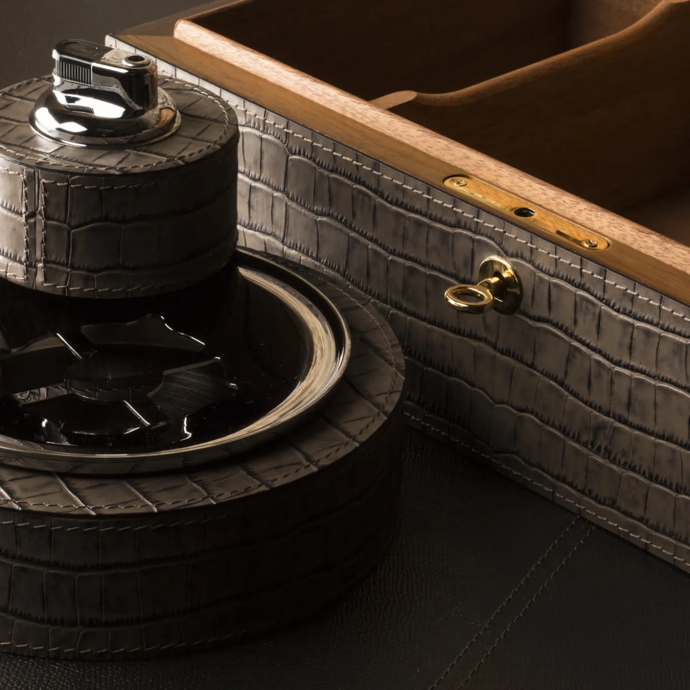 This superb humidor is a perfect gift or precious companion for the cigar lover. The walnut wood case is externally covered with fine leather that can be customized in color and texture. Inside, a cedar wood lining insures a perfect internal humidity level, while two removable dividers offer a practical separation. The case includes walnut wood hinges and a humidifier and a hygrometer to monitor the climate inside the box,
