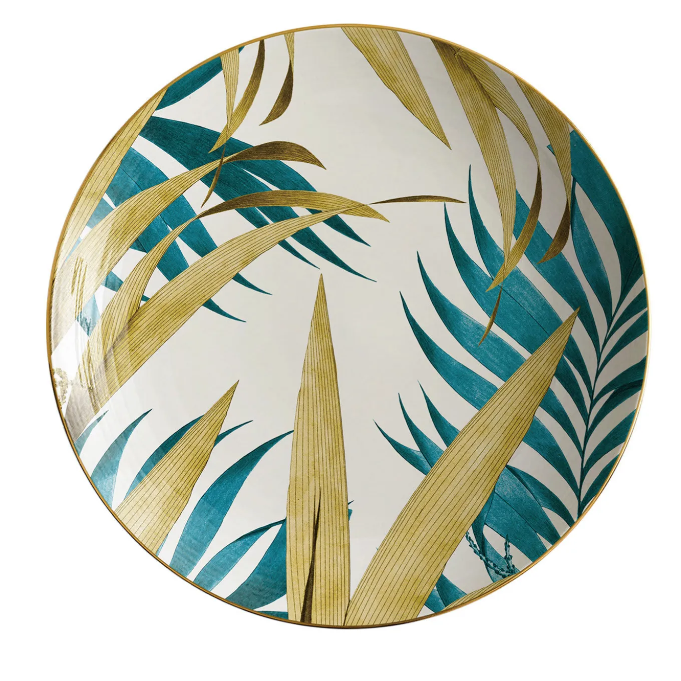 Part of the Las Palmas series of porcelain plates, this fruit plate is adorned with an exquisitely hand-painted rainforest foliage inspired by an area near Palmas, Brazil visited by artist Vito Nesta during his travels around the world. Green and golden hues stand out against the white porcelain, creating elegant color contrasts that distinguish this collection.