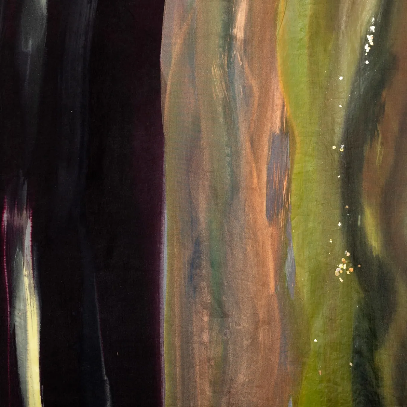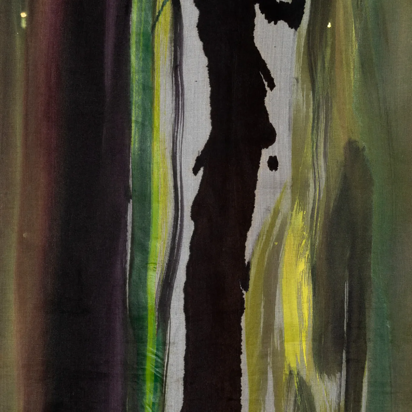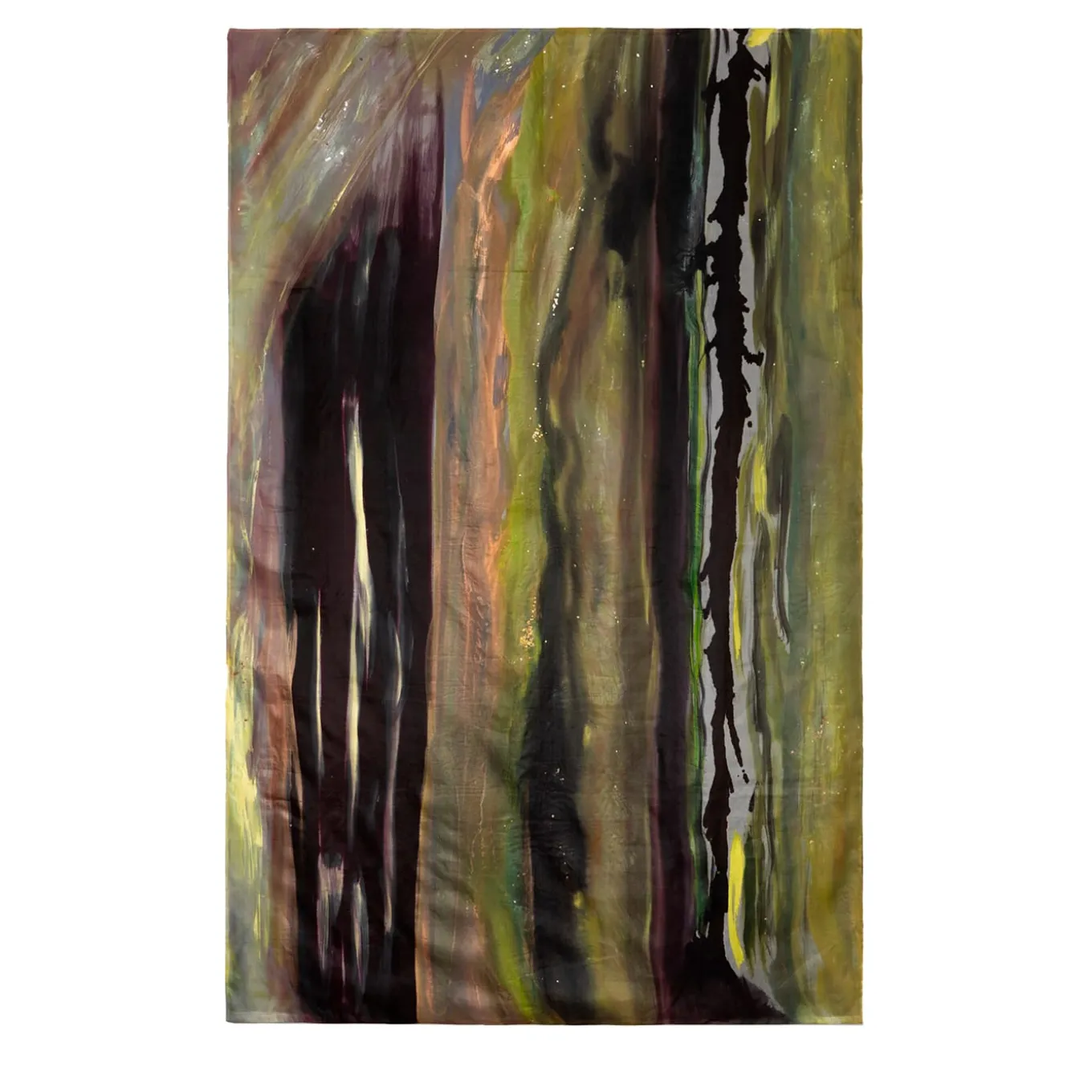 Sparkling with lustrous charm, this tapestry is characterized by soft yet decisive brushstrokes of metallic and iridescent acrylic paint, made by hand on organza silk. Precious and unique, this piece is completed with a polyester back enriched with two pockets for vertical or horizontal hanging. Any slight variation from the pictured item is a testament to its handcrafted nature.