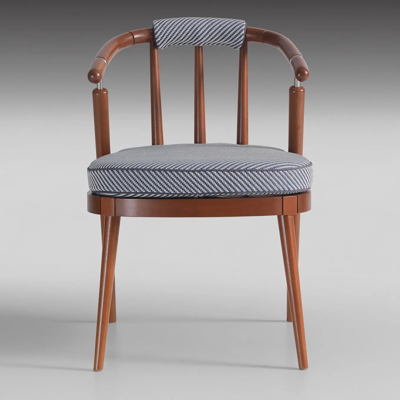 Fashioned of Iroko, this compact armchair flaunts a dynamic distribution of volumes and exclusive sartorial accents making it perfect for elegant relaxed corners in patios or porches. Stainless steel details perfect the steadiness of its enveloping structure, enriched with seat cushion and accent back cushion both woven from the same white fabric and outlined by faux-leather piping.
