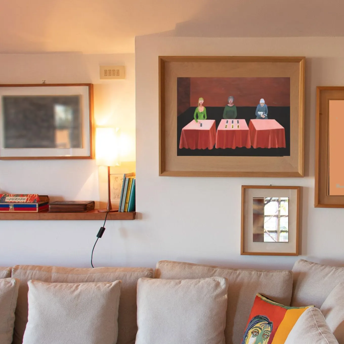 This superb painting offers a metaphorical path through life and its stages. Each sitted at a table covered in a red tablecloth, three women discover through cards what life has or had in store for them. The young lady looks surprised and excited, the middle-aged lady contemplates memories and regrets, while the old lady holds the last card tightly in her hand, looking at it suspiciously. Frame not included.