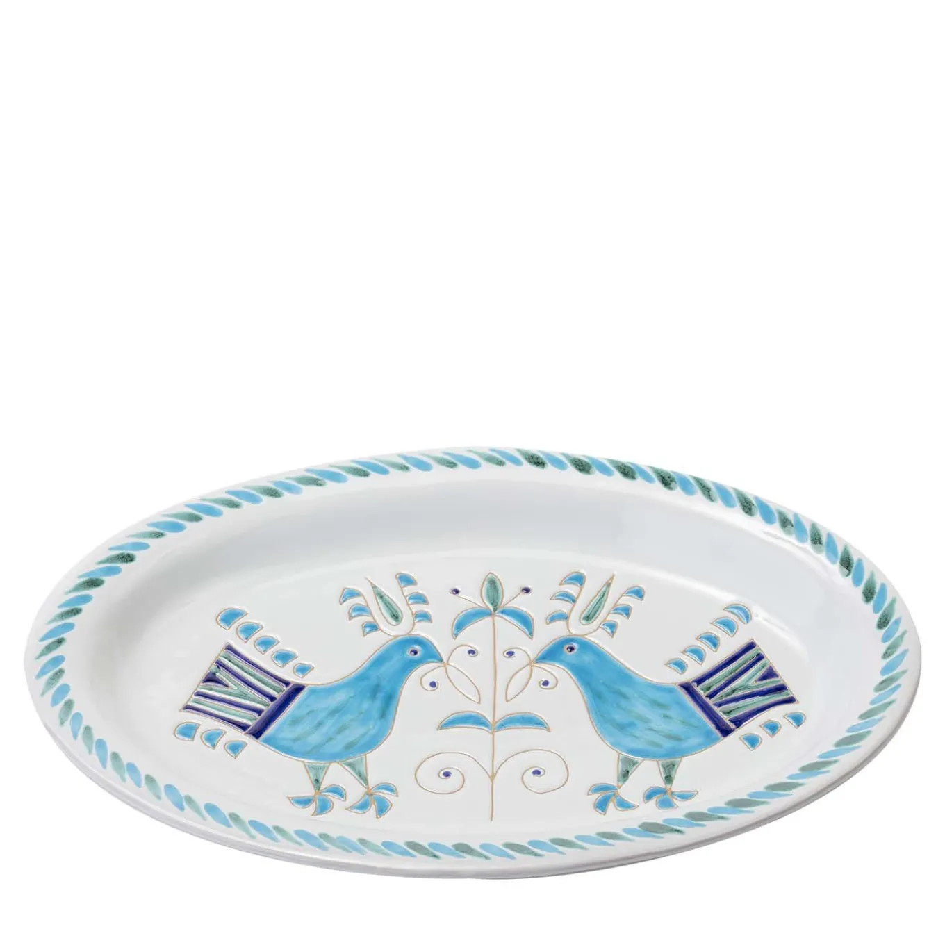 Part of a series of handcrafted tableware that interpret in a fresh and stylistic way the traditional Sardinian “pavoncella” (peacock), this oval tray is graced by the stunning and colorful image of a bird, obtained using the graffito technique, whereby the master ceramists scratch the surface of the terracotta to create the decoration and incorporate vividly hued enamels.