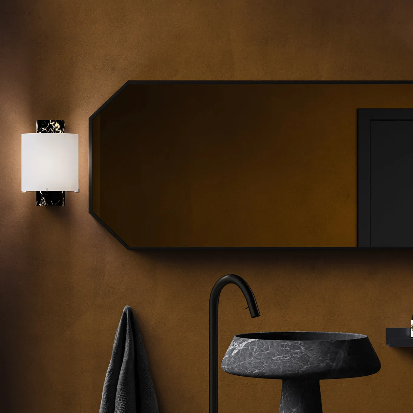 Designed by Matteo Nunziati, this superb sconce will make for a refined and lavish accent piece to the hallway or living area of an elegant contemporary interior. Handmade of Portoro marble, the semi-cylindrical body is completed with a satin white polycarbonate shade. Customizable, it supports an LED bulb (E14/E12 max 8W). Available for customizations, please inquire with the Concierge for options.
