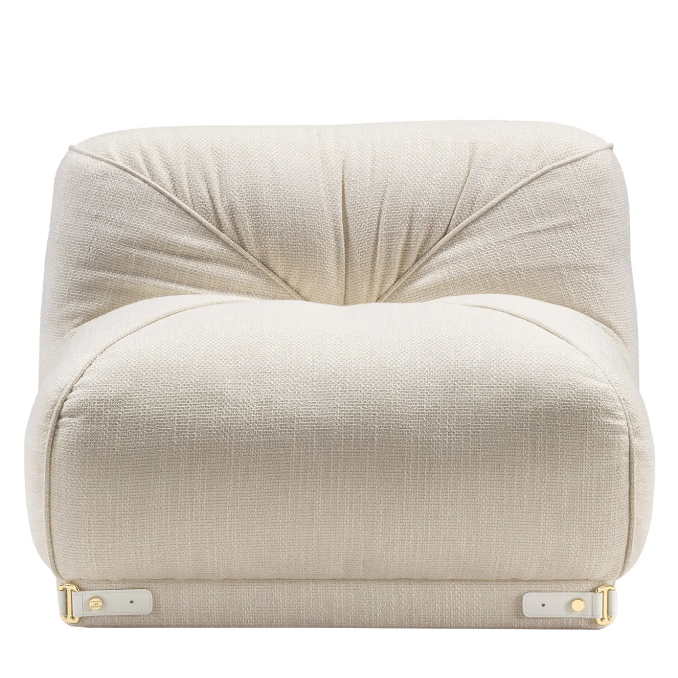 A modular sofa composed of two basic elements that are joined with a belt characterized by a brass buckle. The seat is deep and comfortable with soft and wide curves.
