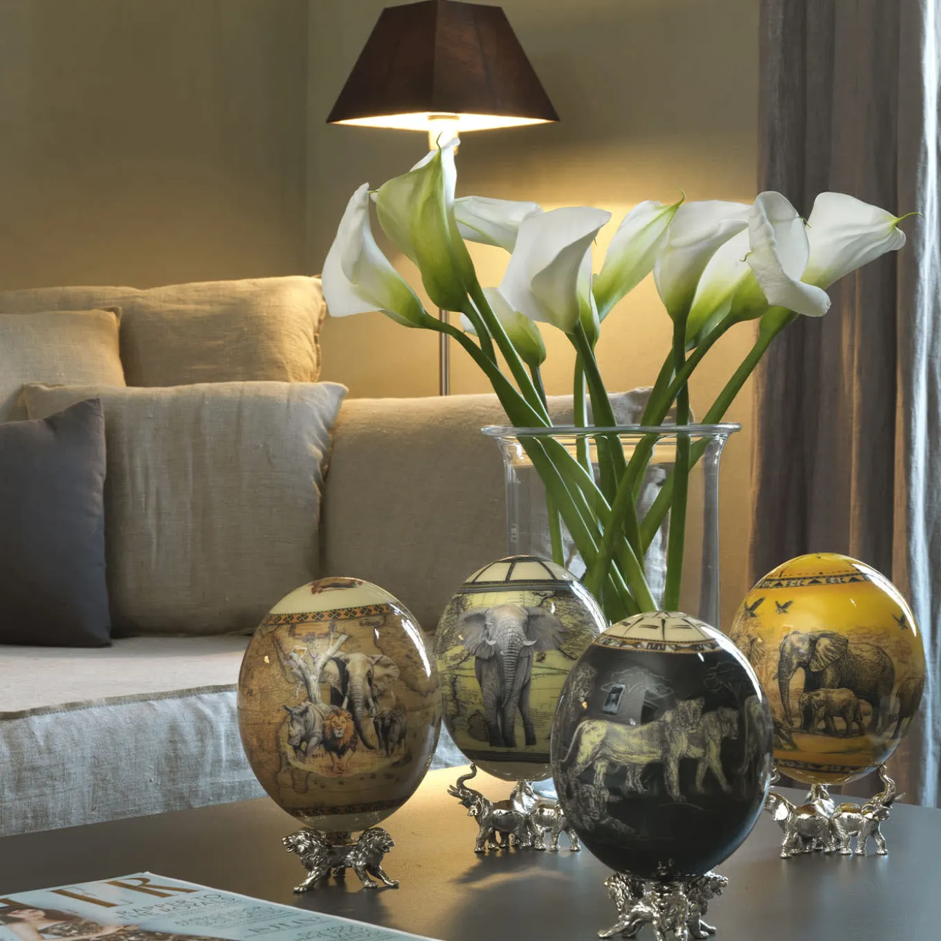 Only unfertilized emptied ostrich eggshells are used to create these collectible pieces, each of which is unique in size and shape. Entirely crafted and painted by hand, this exquisite egg features a 925 silver base with three lions (made with lost wax casting technique) supporting an eggshell with an ink decal motif of a pack of lions on a bold black background. Designed specifically to be viewed from multiple sides, this unique collectible egg makes a treasured gift to be passed down through the generations.