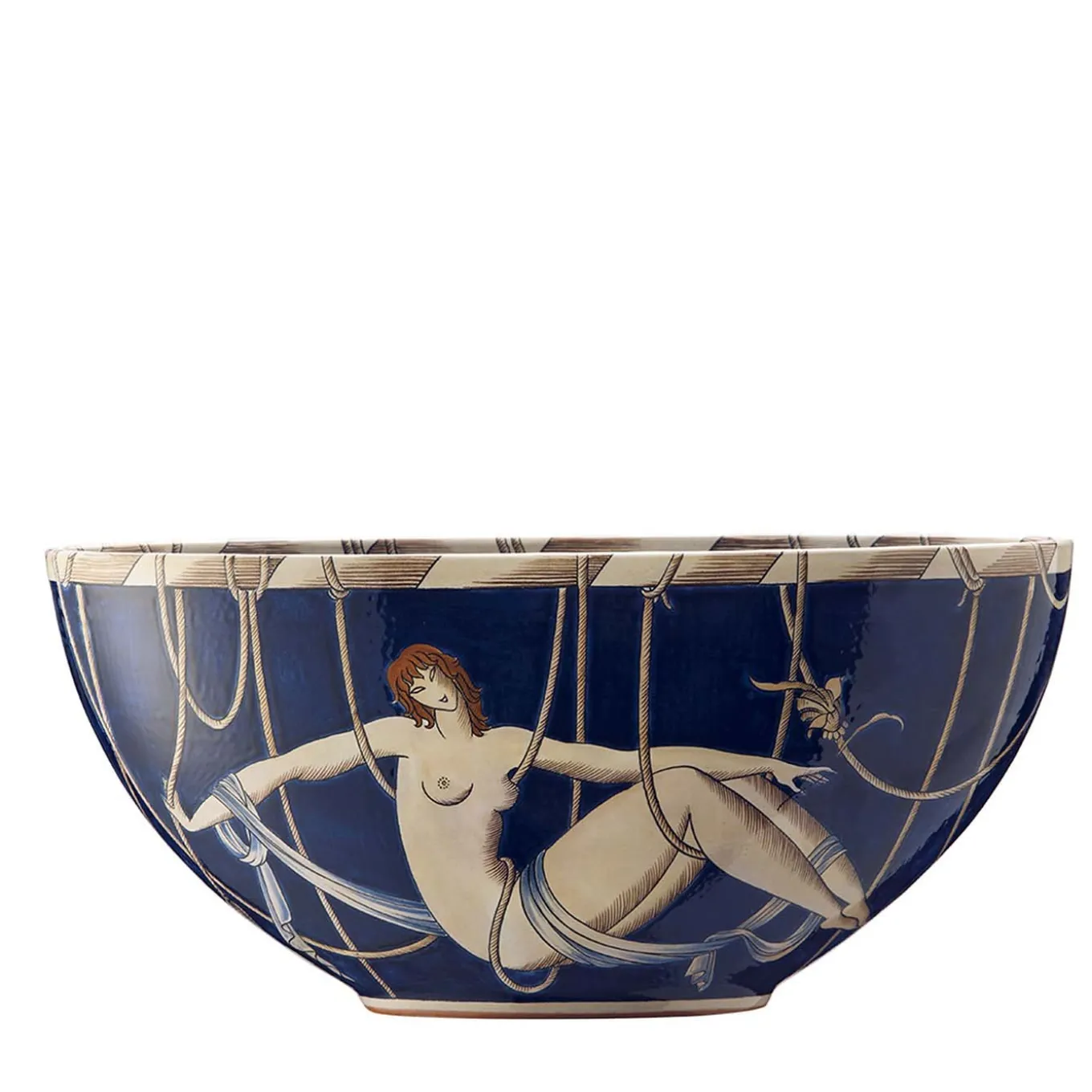 Boasting grace and elegance as she balances on ropes, the woman of this exquisite portrait is one of Le Mie Donne collection (My Women, in Italian). This sublime series of bowls and plates was designed in 1925 by iconic master Gio Ponti and features a series of female figures rendered in the Art Deco style. Acrobats over a strikingly dark background, these women are the subjects of this veritable works of art that will add a unique decorative accent to a modern interior.