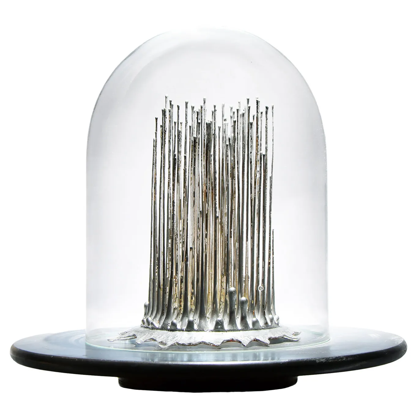 Revealed through a bell jar fashioned of clear blown glass, silvery filaments in Murano glass molten in a single step represent a shimmering, frozen scenario – hence the piece’s name meaning “ice age”. The design draws inspiration from the utopian “Invisible Cities” by Italo Calvino and their ethereal, airy flair. Reproducible in a similar yet never identical shape, the sculpture rests on a swivel wooden support coated with a micro-cement, textured resin embellished with a silvery finish.