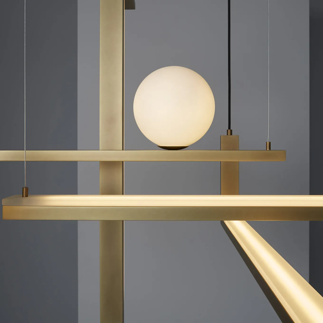 Radiating a diffused, elegant light, this sculptural pendant lamp will enrich any interior with its warmth. The silhouette boasts five elements in burnished natural brass suspended on self-supporting black fabric cords and steel cables with a rapid fixing system. Two spherical satin glass diffusers complete the piece, each supporting G9 max 5W bulbs (not included) of 350lm and 2700°K. Three of the five horizontal elements feature LED strips of max 12W, 24V with 1250lm and 2700°K. This striking piece is also available in polished or matte black nickel, please ask the Concierge for details.