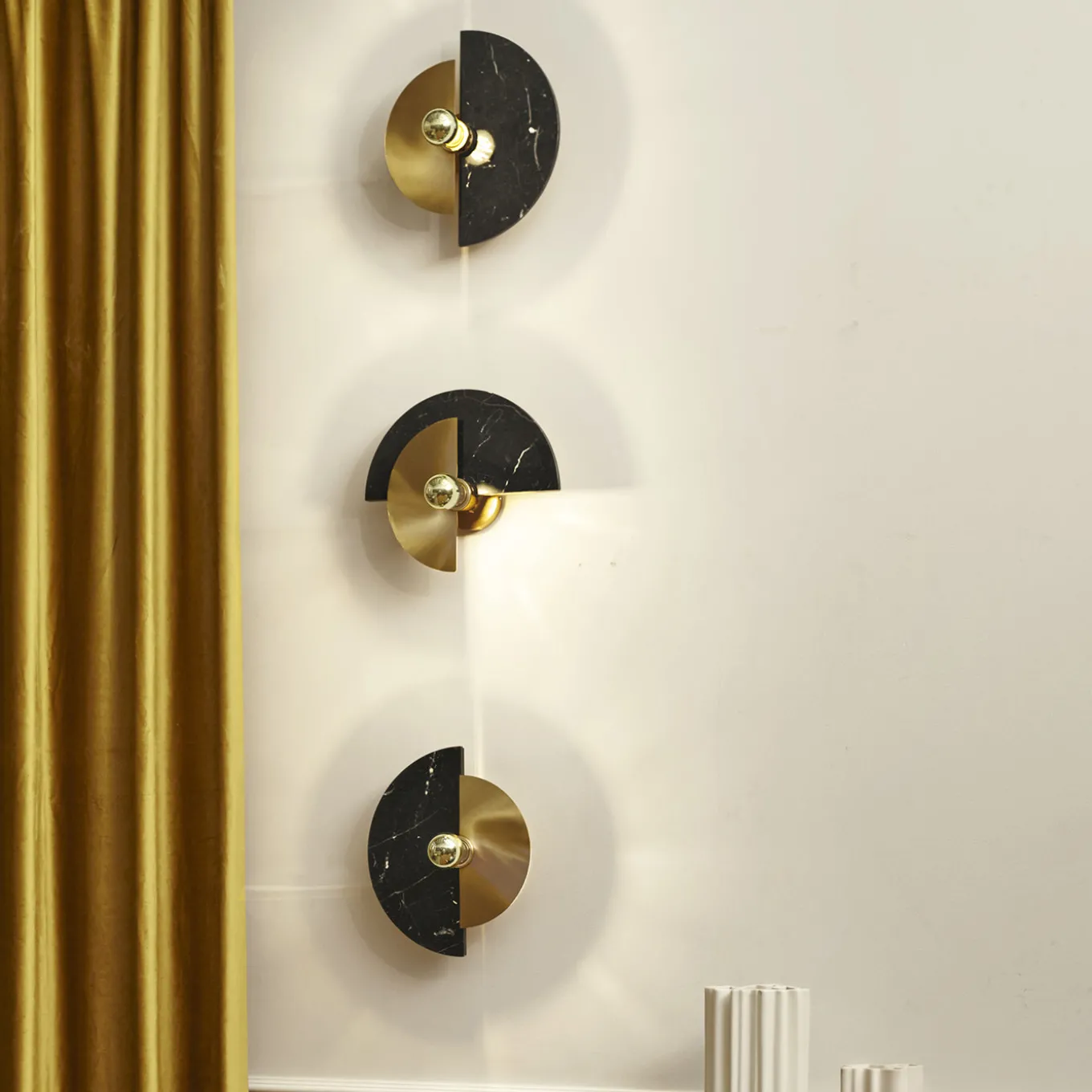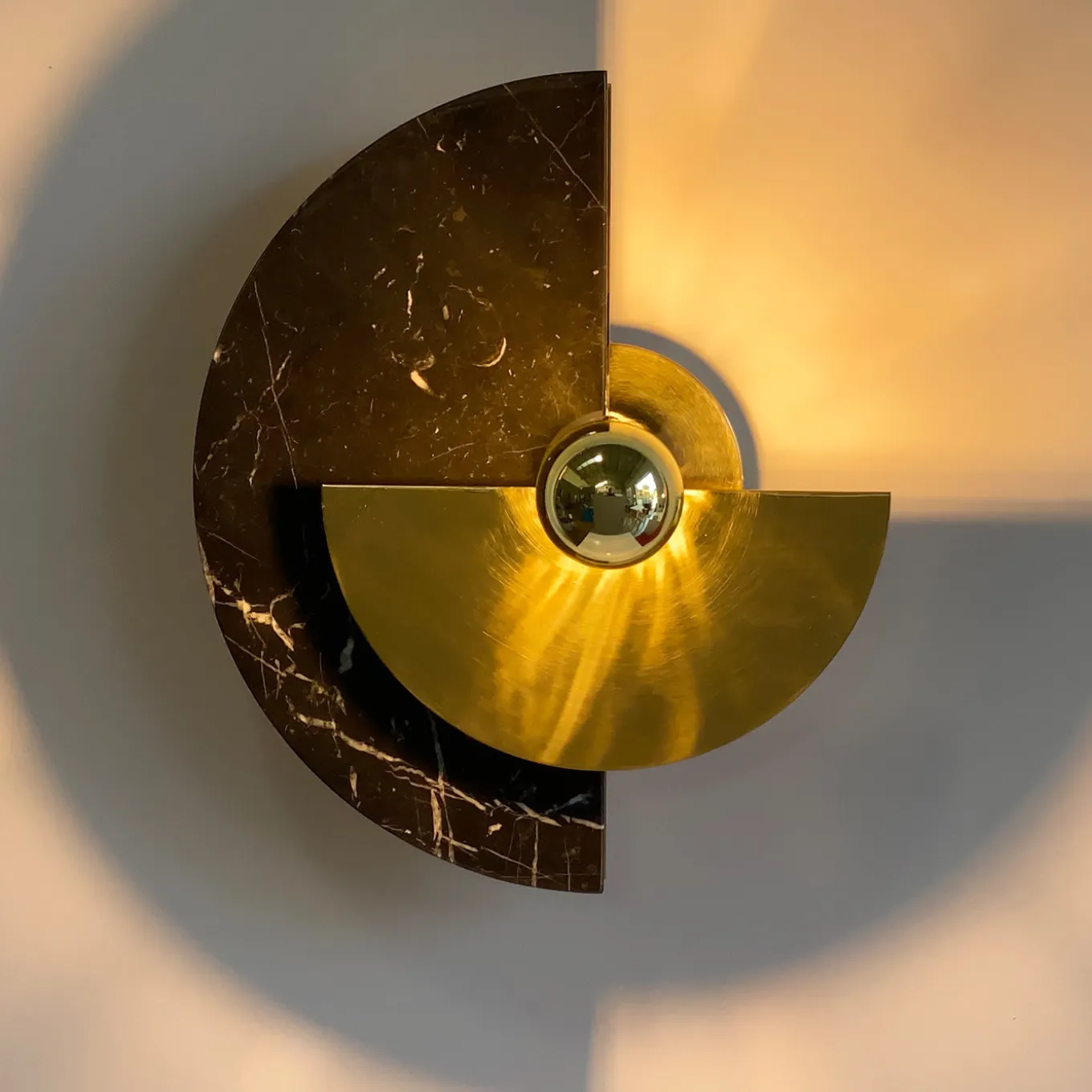 The Levante wall sconce with its circular shape is a strong reference to the sun. The possibility of placing the discs in 12 different positions offers original plays of light and shadow projected on the wall. The brass structure and disc, combined with the other marble disc, are illuminated by a light bulb with a golden cap, which emphasizes the tones of the materials and, at the same time, illuminates the wall with warm colors.