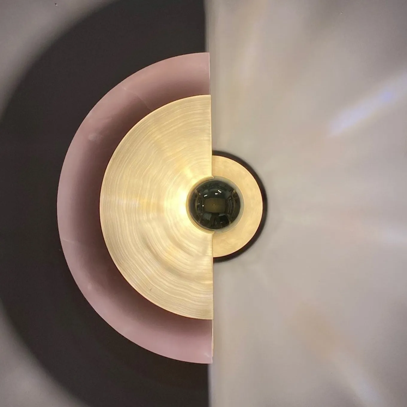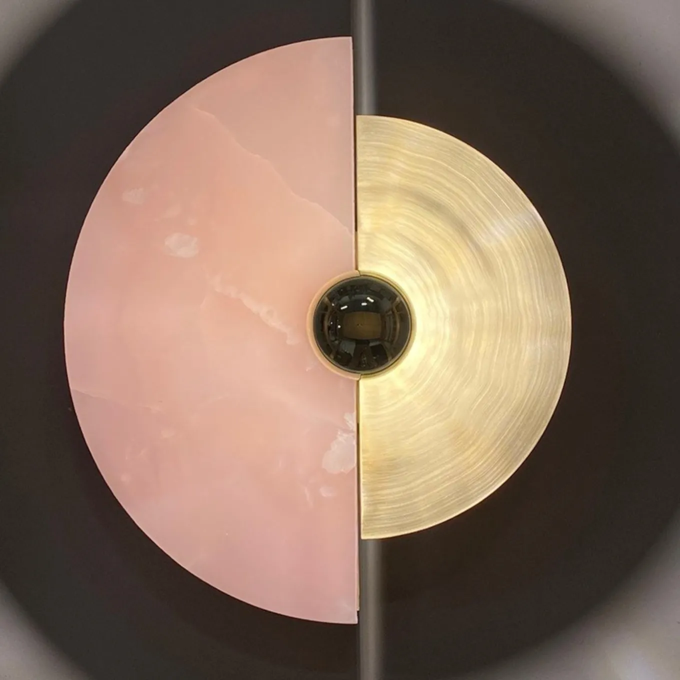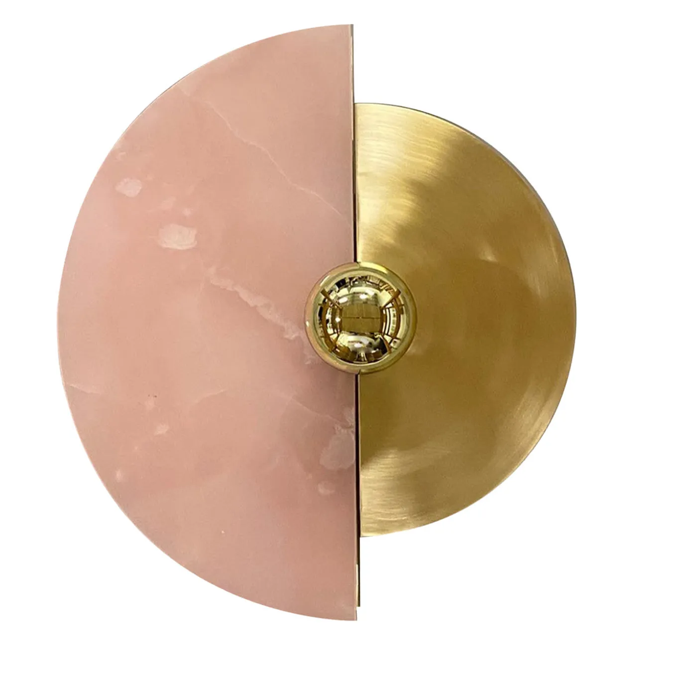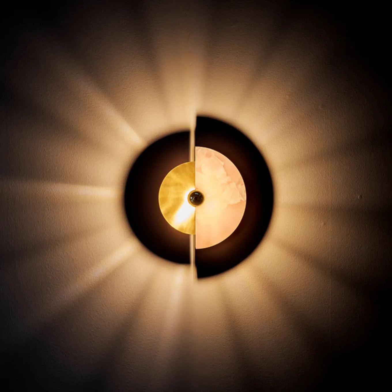 The Levante wall sconce with its circular shape is a strong reference to the sun. The possibility of placing the discs in 12 different positions offers original plays of light and shadow projected on the wall. The brass structure and disc, combined with the other onyx disc, are illuminated by a light bulb with a golden cap, which emphasizes the tones of the materials and, at the same time, illuminates the wall with warm colors.