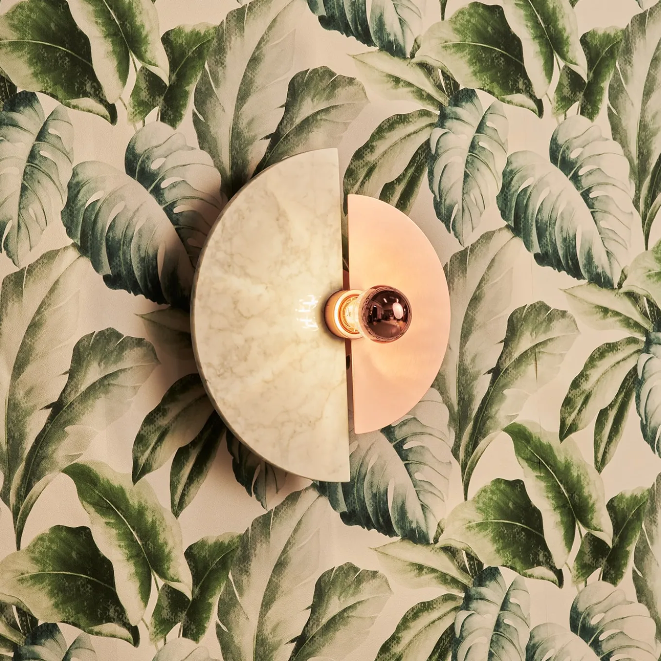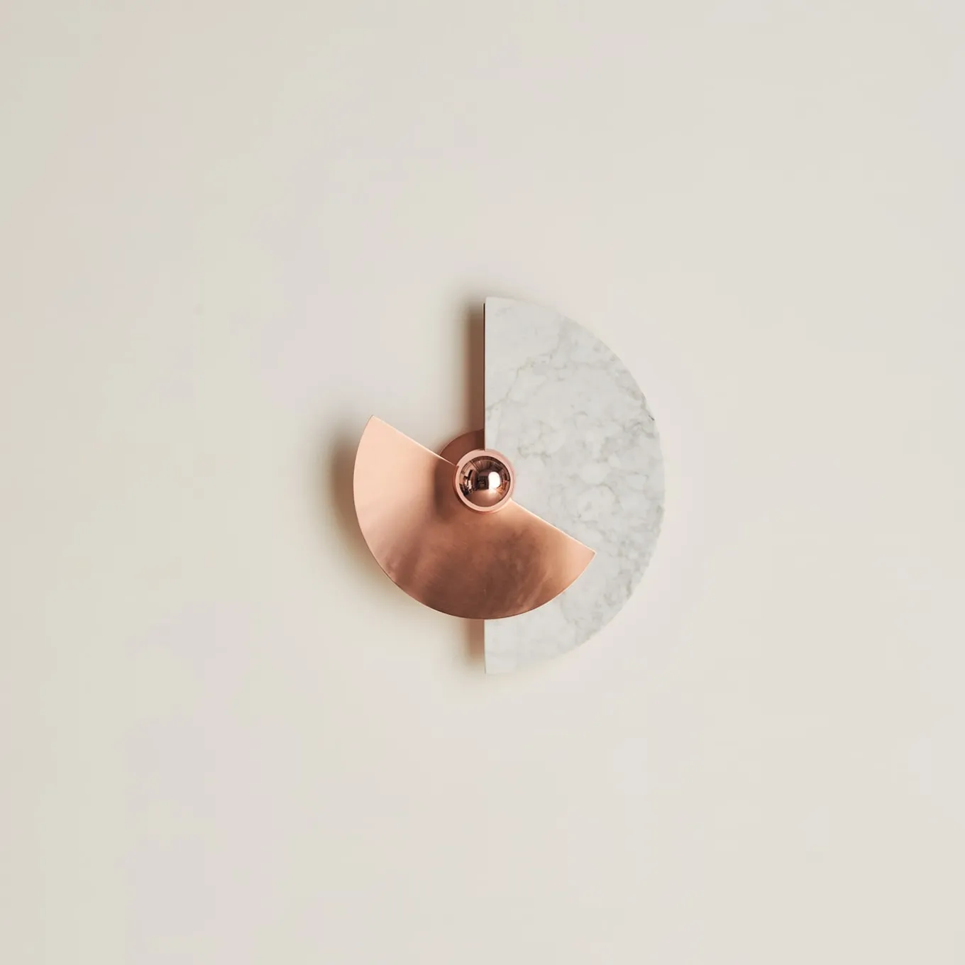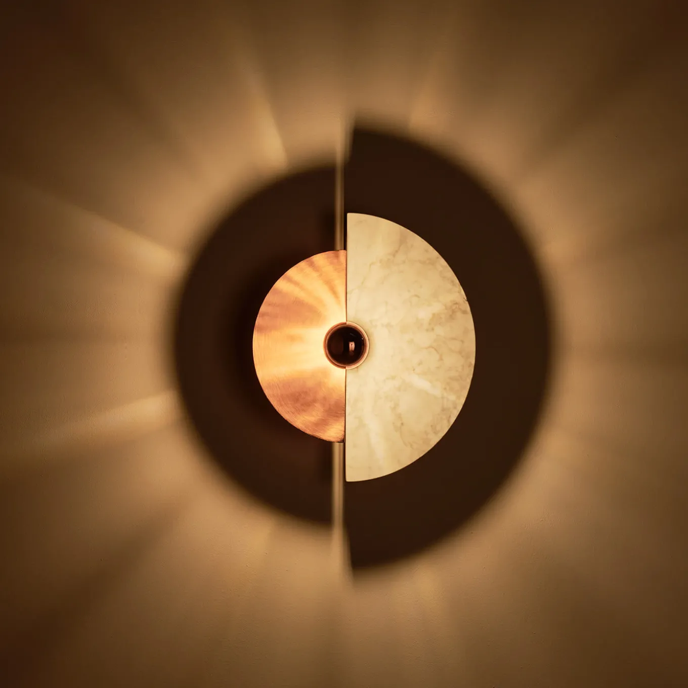 The Levante wall sconce with its circular shape is a strong reference to the sun. The possibility of placing the discs in 12 different positions offers original plays of light and shadow projected on the wall. The brass structure and disc, combined with the other marble disc, are illuminated by a light bulb with a golden cap, which emphasizes the tones of the materials and, at the same time, illuminates the wall with warm colors.