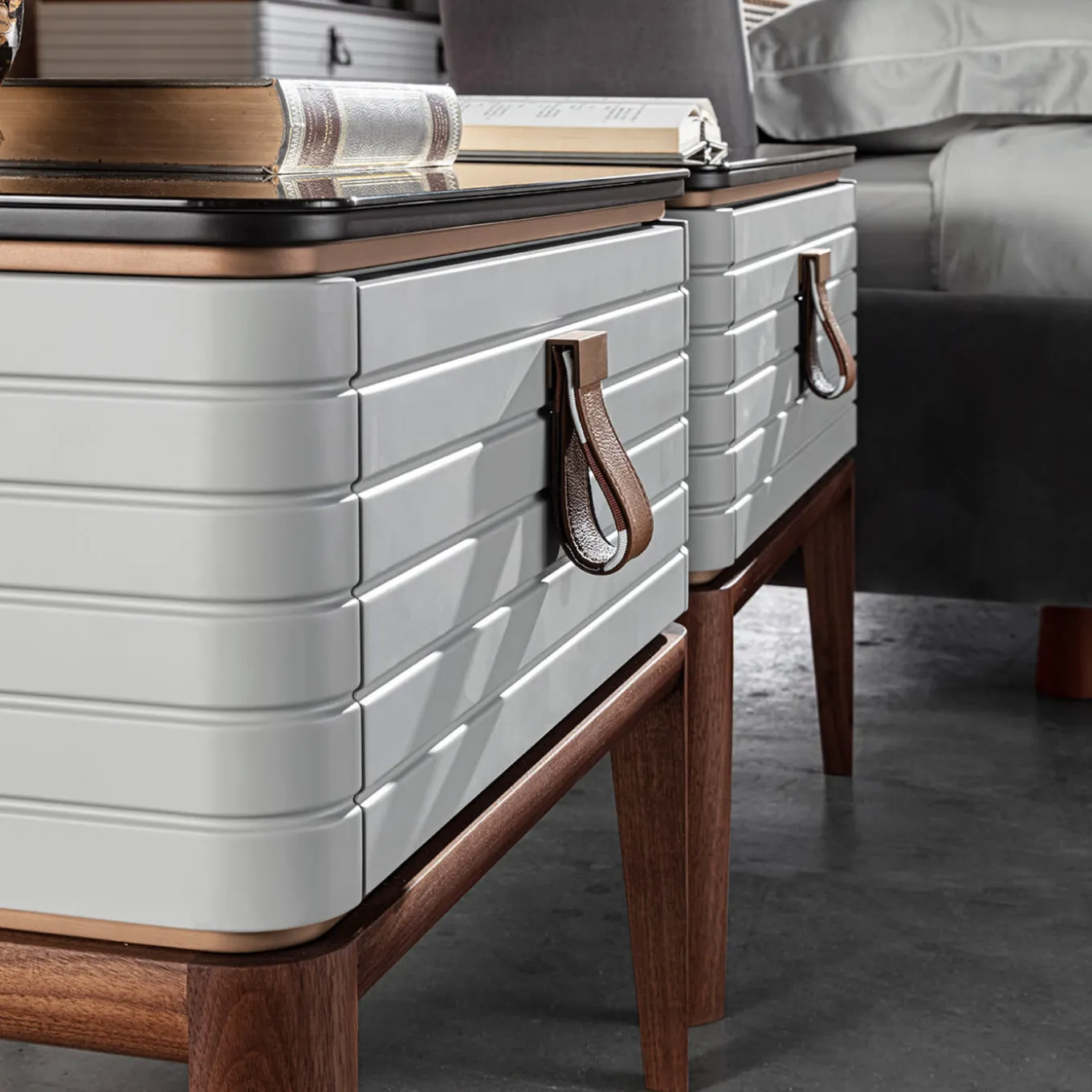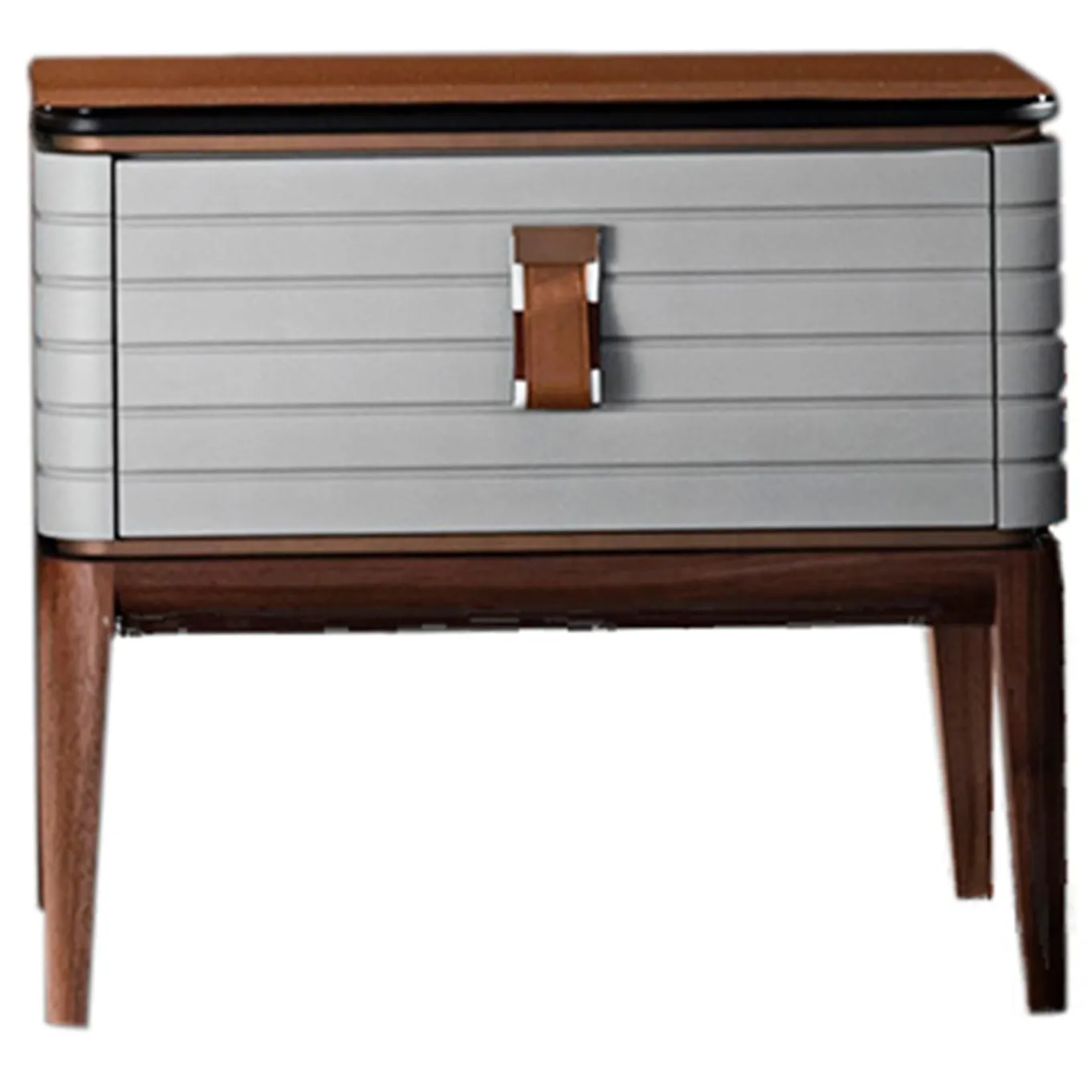 Ideally complementing bedrooms with its dresser counterpart for a coordinated statement, this wooden nightstand is a clever synthesis of modern and retro references. The gray-lacquered frame – housing the drawer with an exclusive leather handle- is enriched with a captivating grooved texture and raised on a sturdy Canaletto walnut base consisting of four dynamic tapered legs. A tabletop in bronzed mirrored glass seals the design. Please ask the Concierge for customizations.