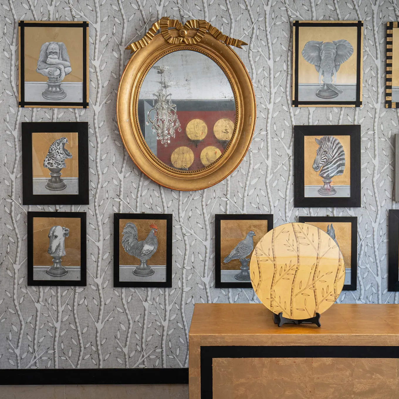 This original 2021 drawing from the series “Animali su Piedistallo” features a greyhound’s head rendered in graphite on paper, enhanced with manually applied pure gold leaf. The work explores themes of cultural hierarchy by placing an ordinary animal on a traditional pedestal, symbolizing power and reverence, while inviting reflection on human perceptions and biases. The patterned golden background heightens the contrast, creating a sense of displacement and deeper contemplation.