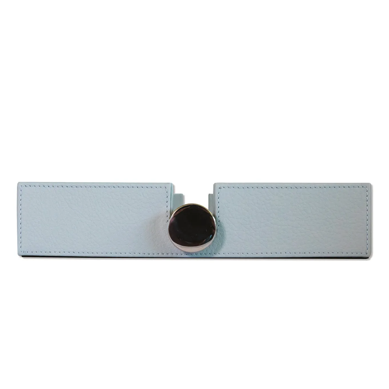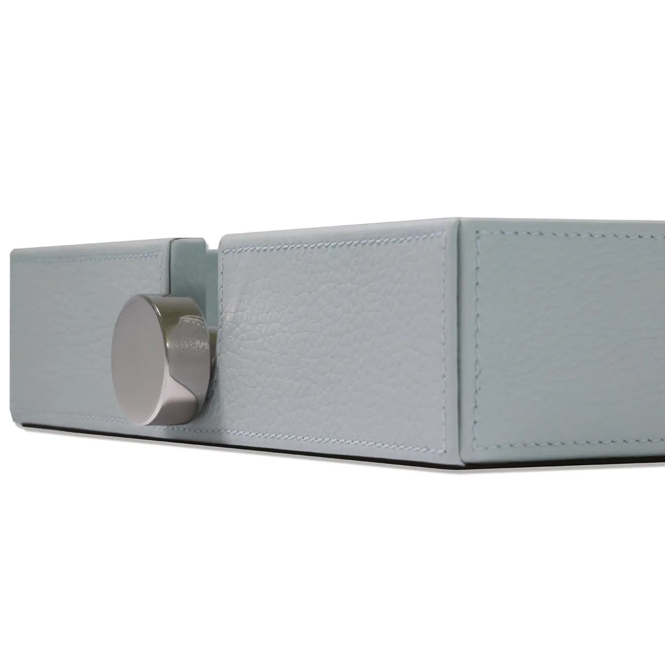 A sophisticated addition to a modern or contemporary dining room, this napkin holder is fashioned of wood elegantly upholstered with light blue soft grain leather. At the center of the open box, a stainless steel bar will keep the napkins still for easy storage and use. Available in 13 different colors to taste, please check the Artemest catalog.