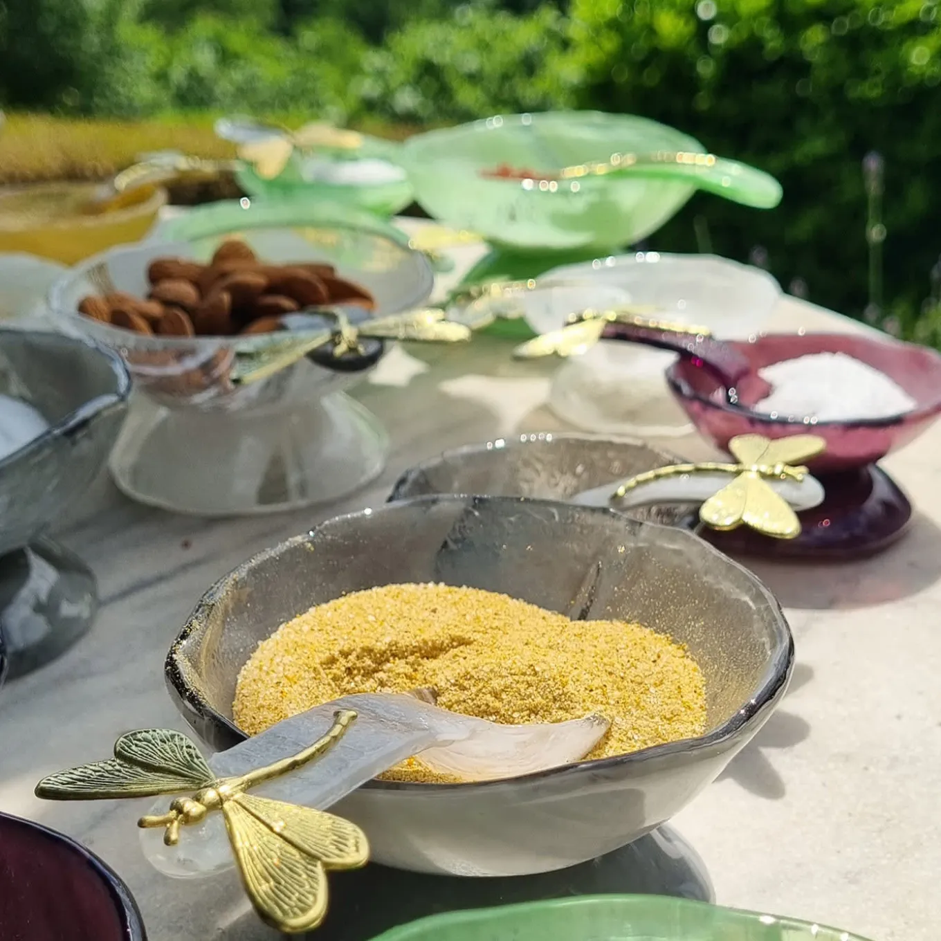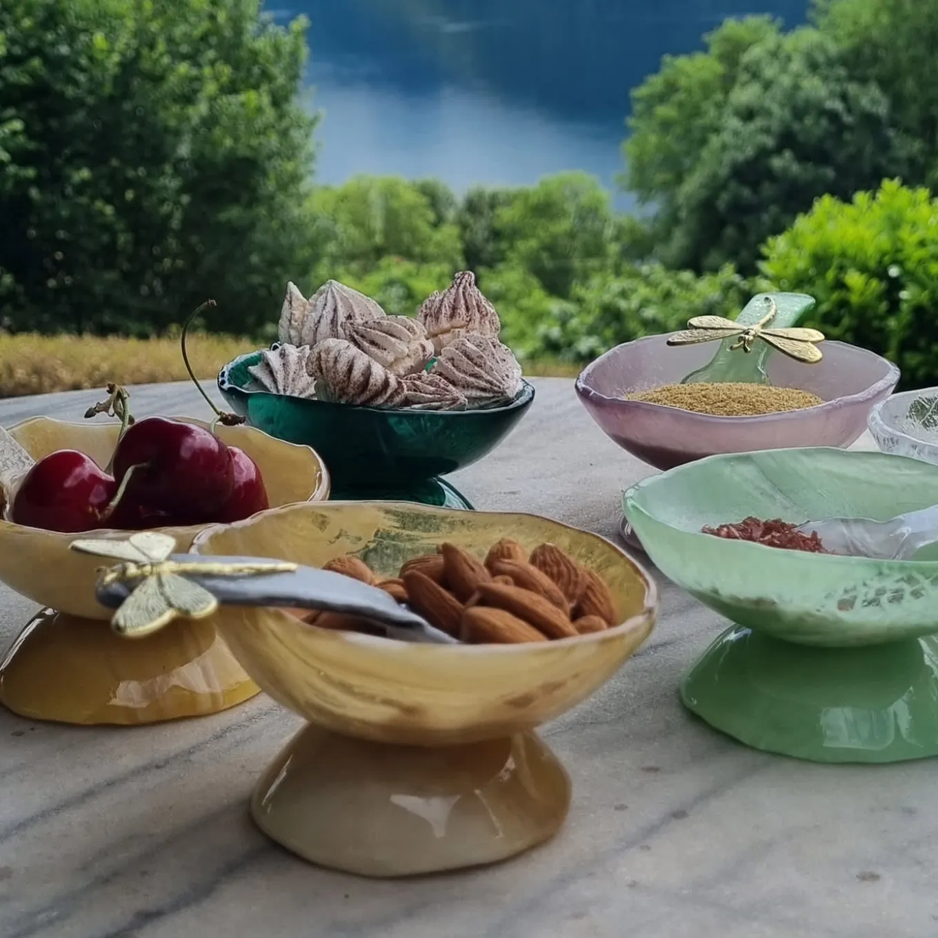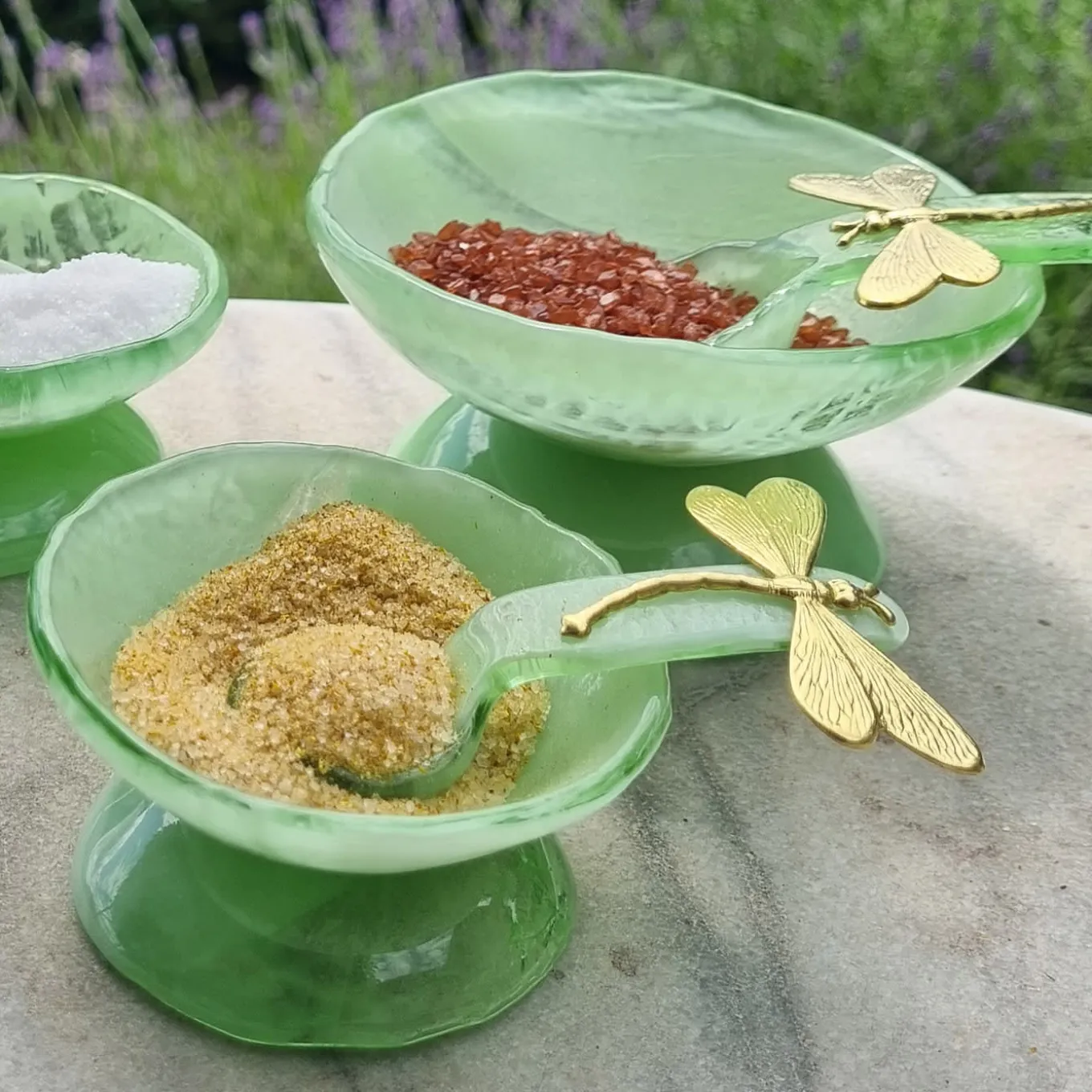 Showcasing a vibrant green hue, this stunning set of two salt cellars will be a versatile table accessory in refined indoor or open-air settings. Designed by Daniela Poletti and skillfully hand sculpted in superb Murano glass, the bowls feature delightful pedestal bases and exquisite brass dragonflies adorning each matching spoon. A perfect housewarming gift, which may also be matched with similar elements for a captivating chromatic effect. Measure 9cm in diameter.
