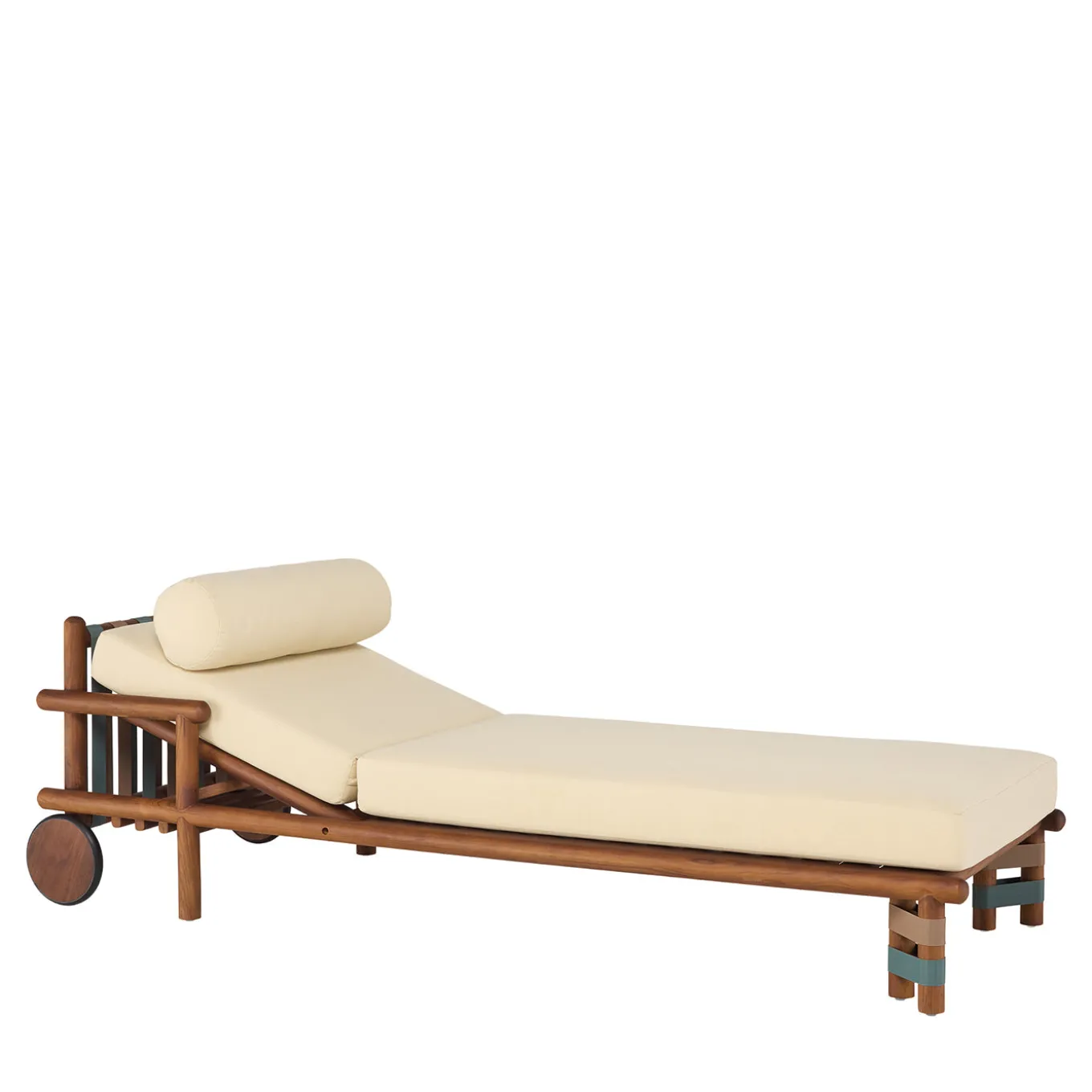The Lignes sunlounger features a refined design that blends tradition with modernity, enhancing outdoor living spaces with elegance and tranquility. Its teak wood frame with circular profiles is seamlessly integrated with outdoor fabric straps in colors inspired by natural clays and ancient herbs, creating a unique harmony of soft, earthy tones. The adjustable backrest and smooth contours offer ergonomic comfort for relaxation. For other color combinations options please contact the Concierge. Designed by Marco Gennaro.
