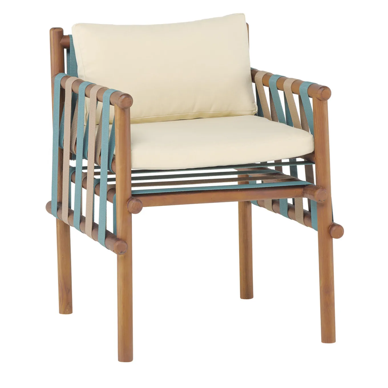 This dining chair from the Lignes collection features a refined design blending tradition and modernity, ideal for enhancing outdoor spaces with a serene atmosphere. The teak frame with circular profile is wrapped in outdoor fabric straps integrated into the structure, available in mugwort green and shadow land tones inspired by natural clays. Cushions add comfort while the versatile color options allow customization to various settings. For further information please contact the Concierge. Designed by Marco Gennaro.