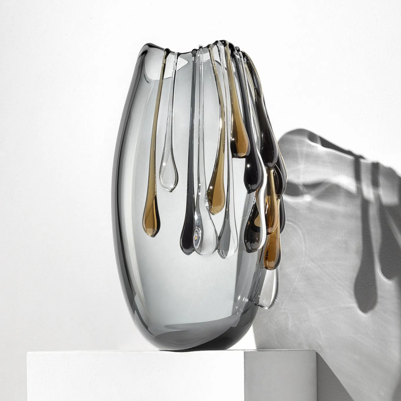 This medium-sized decorative vase features a soft oval silhouette where gray glass forms the main body. Elongated droplets in varying shades of warm amber and smoky gray cascade down its sides, creating a delicate contrast and adding dimensional texture. The design captures the essence of rain meeting light, inviting a contemplative atmosphere to any setting. This piece combines subtle artistry with a balanced interplay of translucency and muted tones.