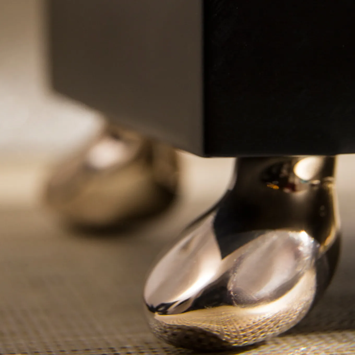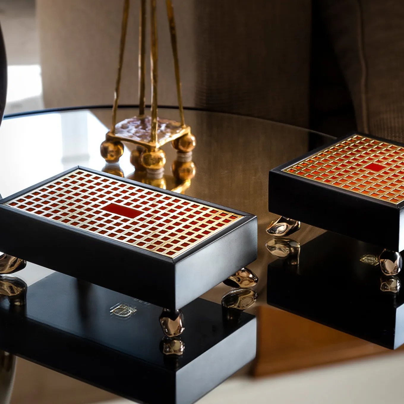 Superb for collecting beauty essentials on a vanity or dresser, this elegant box exemplifies the brand’s luxe appeal. Glossy metal feet recalling pebbles sustain the storage compartment, which is organized in two different-size boxes nested inside each other. Externally lacquered in dark-brown for a versatile, deep color statement, the interior flaunts a vibrant orange lacquer revealed by lifting the grid-like brass lid, its design inspired by the floor of the Archdiocese Munich Cathedral