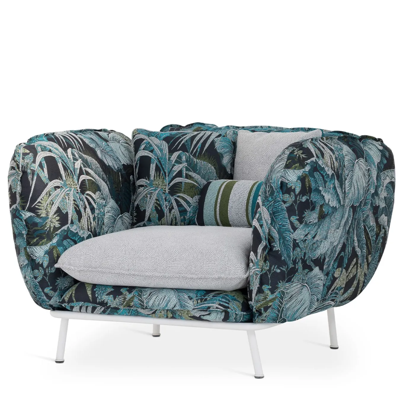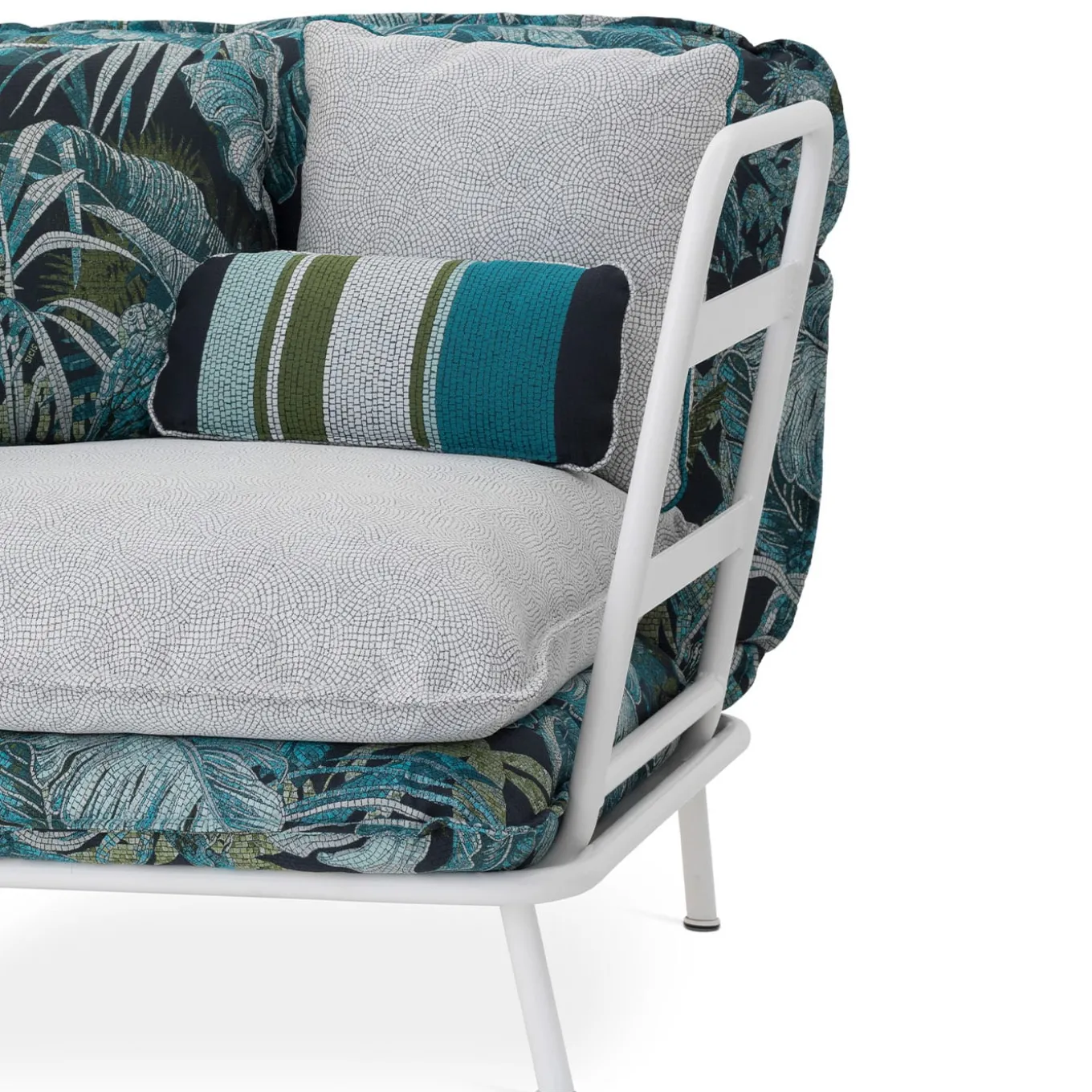 Utmost comfort and a refined aesthetic merge in this gorgeous outdoor armchair. inspired by one of the most intriguing islands of Sicily. Made of matte-white aluminum, it is padded with multi-density polyurethane foam, recyclable polyester fiber, and waterproof cotton, all upholstered with a removable, waterproof, and washable Lubuck Labuan Ocean and Ivory fabric. The cushion is not included. Please contact the Concierge for further details.