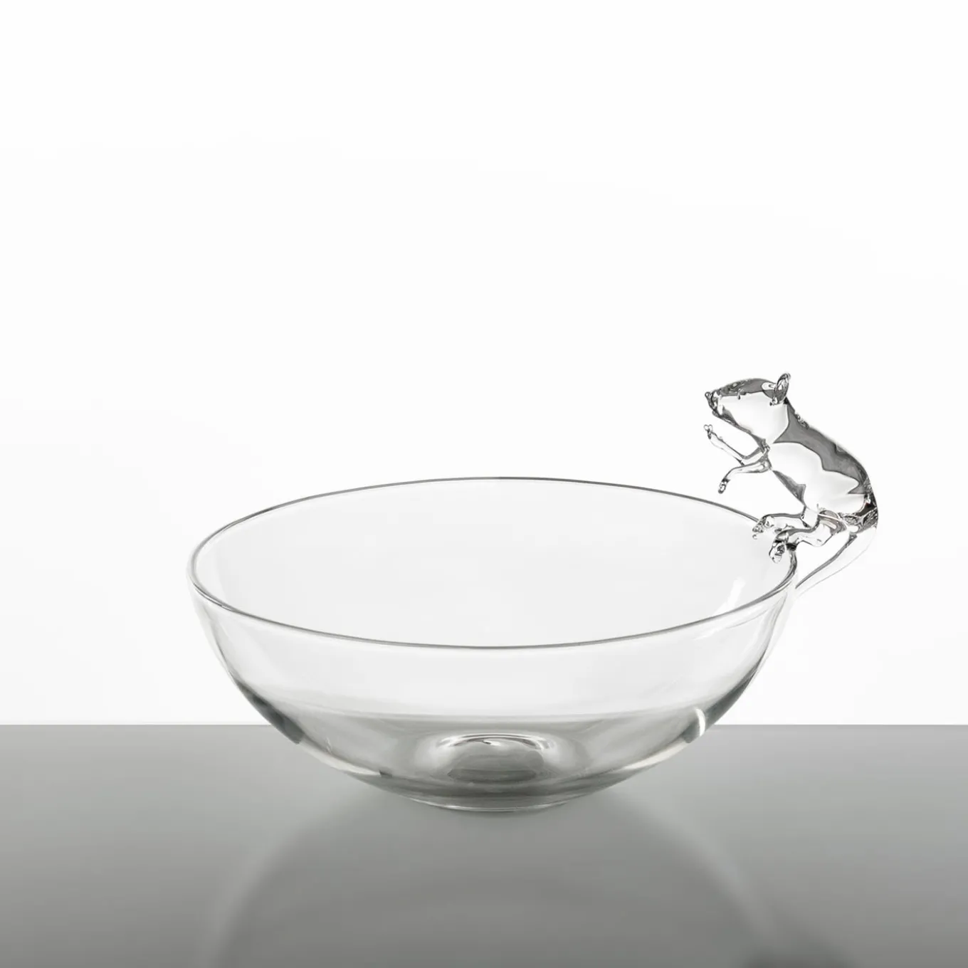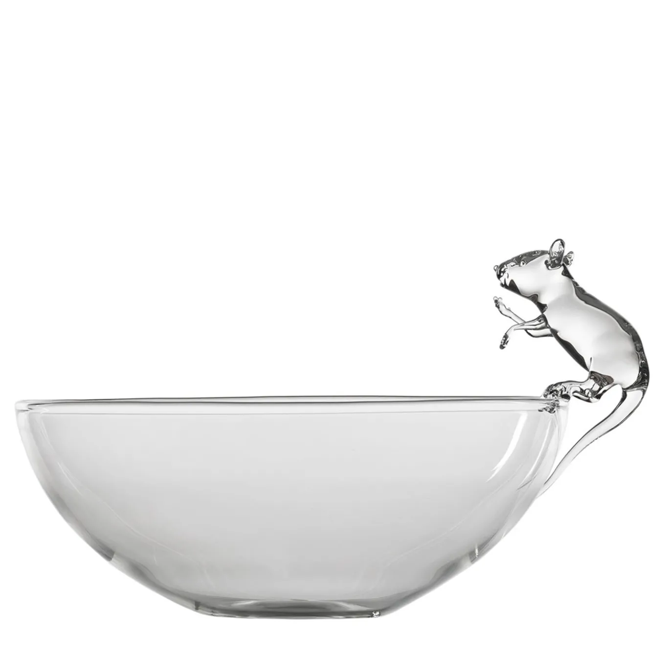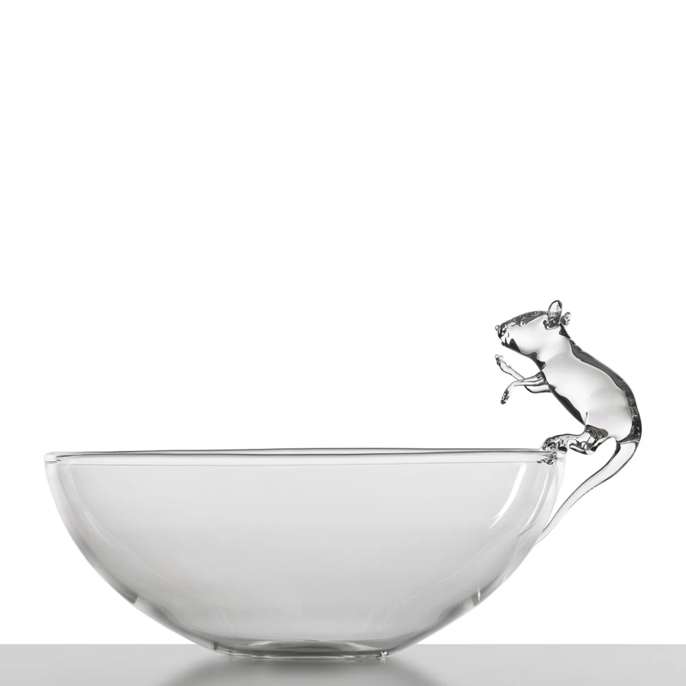 A hand-blown glass bowl by Simone Crestani. Crafty, clever, always busy; quick and snappy, alert and judicious. As small as it is nimble, a glass mouse intent on stealing a morsel of food, paws happily as if it were nothing, joining the banquet of your table in a bowl crafted entirely by hand.