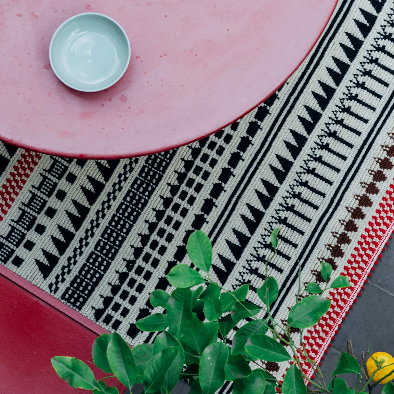 Each rug is a unique piece, hand-made in Sardinia using an ancient grain-weaving technique native to the island known as ‘a pibiones’, dialectal word for “grain”. The geometric shapes and colors spark the interest of the onlooker by enticing them to decipher the script: the rug tells the story of Little Red Riding Hood, each row showcasing an element of the story, from the grandmother’s house, to the hunter’s rifle. Braille characters conceal the name of the textile artwork.