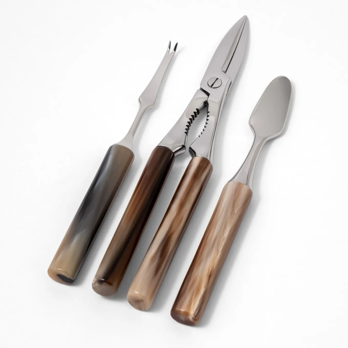 The Lobster Cutlery Set in Natural Horn features an exquisite arrangement designed for seafood enthusiasts. This luxurious set includes a lobster fork (175 mm), lobster pliers (220 mm), and a lobster spoon (175 mm), each meticulously crafted to enhance the dining experience. The handles, made from natural horn, provide a unique and stylish touch, ensuring both comfort and elegance during use. The stainless steel components offer durability and precision, making this set not only a beautiful addition to any table setting but also a practical choice for enjoying lobster. Part of the Classic Collection.