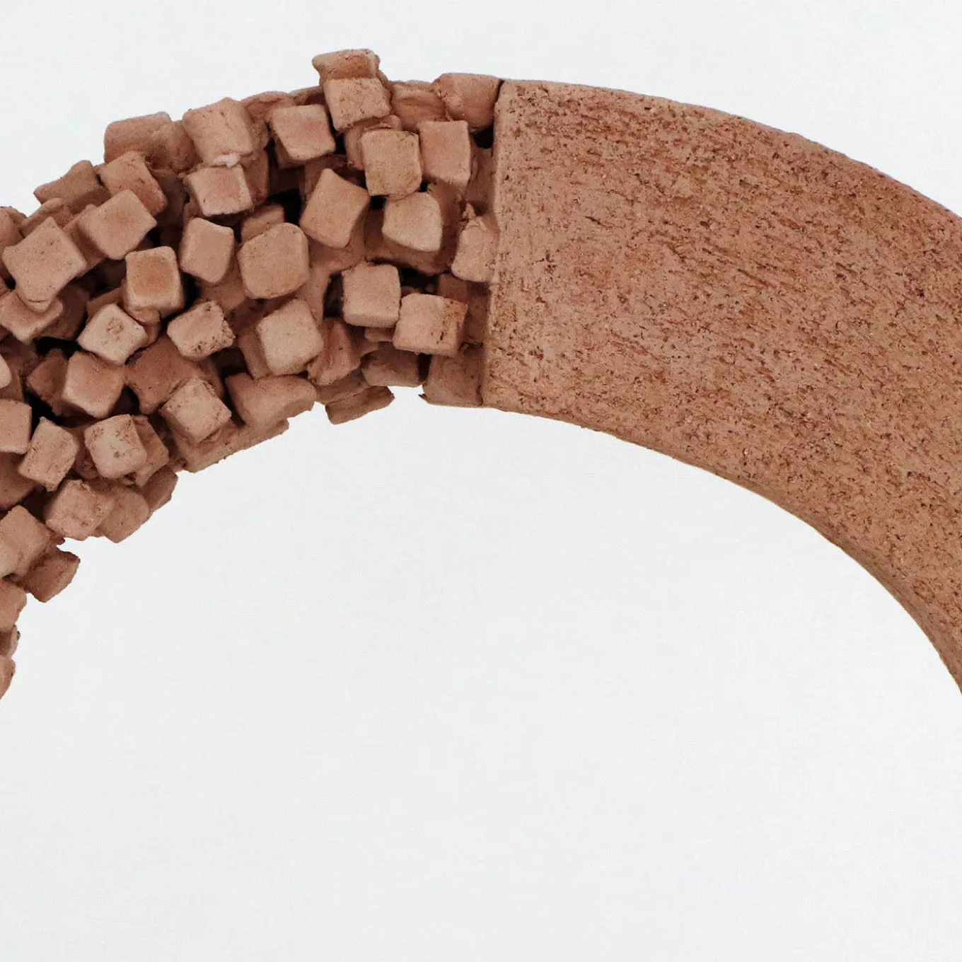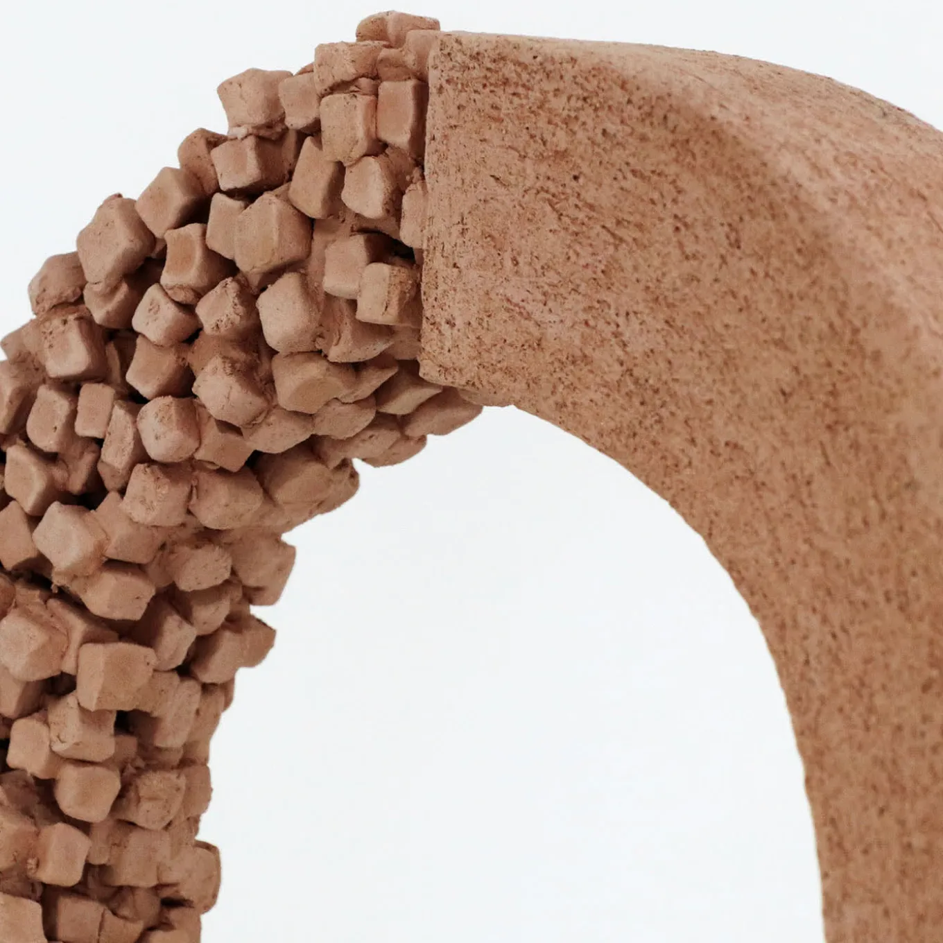 An extraordinary exercise of shapes and balance, this sculpture belongs to an exclusive series of refined designs handcrafted of natural stoneware. Merging contrasting geometries in its ring shape enriched with small cubes, it explores the idea of explosion and implosion, of a revolution of the Self. This is a one-off design, please consult the Artemest catalog for other design options.