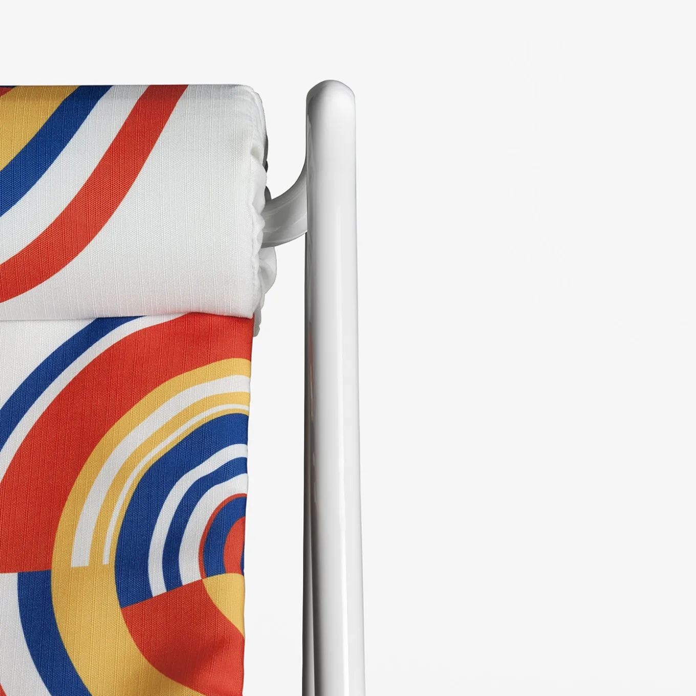 Recalling the classic shape of curved wooden rocking chairs, the voluptuous geometry of the steel tubular frame of this armchair convey a unique aesthetic that merges functional and stylistic elements. Designed by Italian architect Gae Aulenti in 1964 as part of the Locus Solus Collection of outdoor furniture, the white finish of the structure provides the perfect frame for the exclusive, colorful print of the fabric sling and bolsters marking the headrest and leg rest. The new editions re-introduced by Exteta in 2016 can be customized in all its catalog fabrics. If the products are placed completely outside, nightcovers that can be purchased at an extra price are recommended. Please contact the Concierge for further information and options.