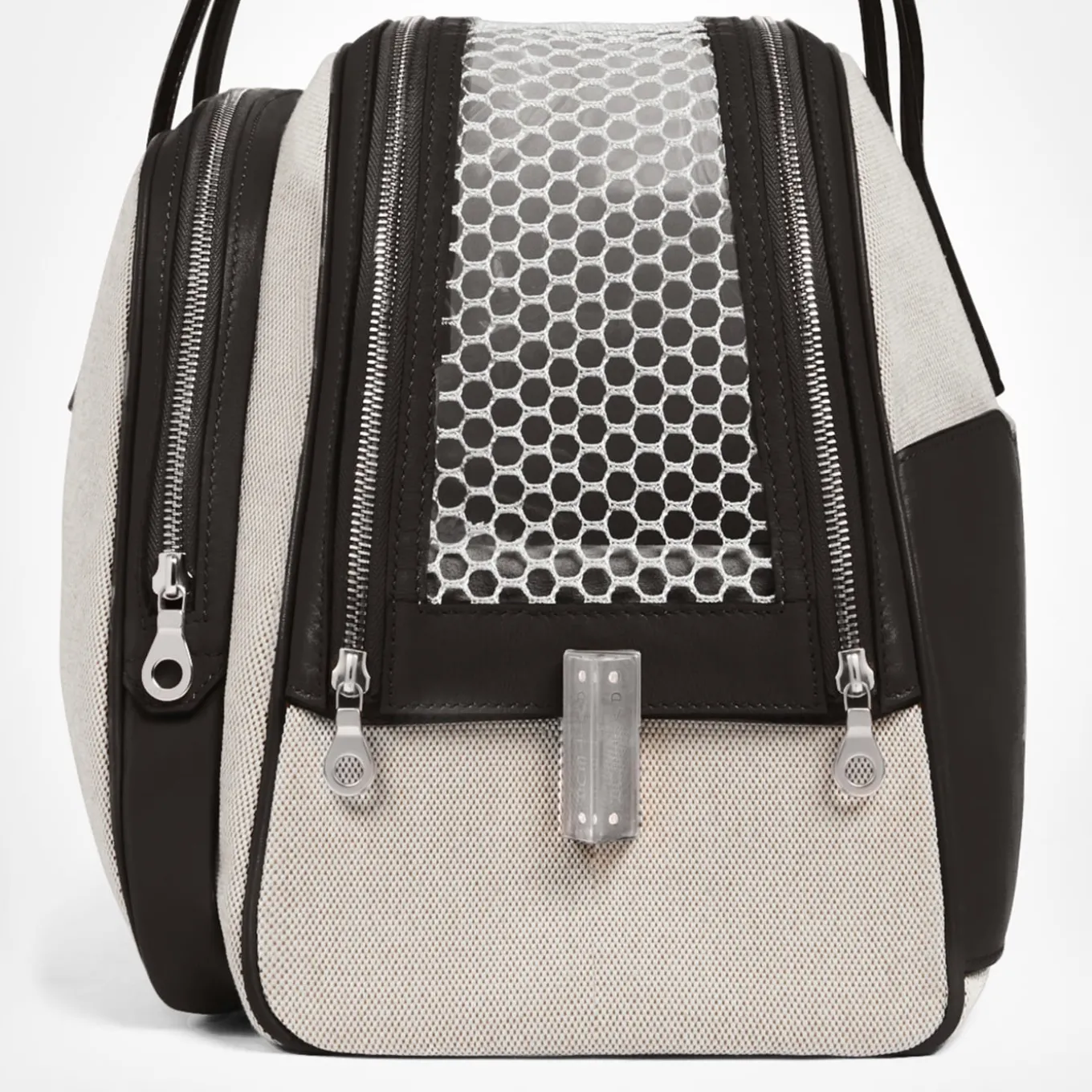 The Lola pet carrier bag is a perfect blend of style and functionality. Crafted from durable canvas with elegant black leather trim, this carrier is designed for both comfort and practicality. The high-quality ruthenium zips add a touch of sophistication, while the interior is lined with washable microfiber.