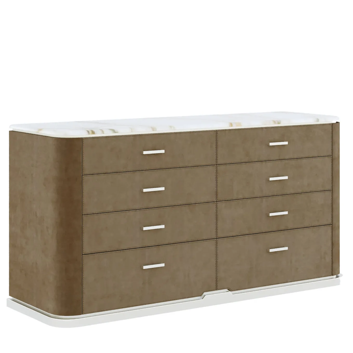 Chest of drawers with wooden structure. Drawer fronts are covered in Nabuk leather. It has a white Michelangelo marble top and metal handles in a champagne finish. For more information contact the Concierge. This piece is part of the Secret Shapes Collection.