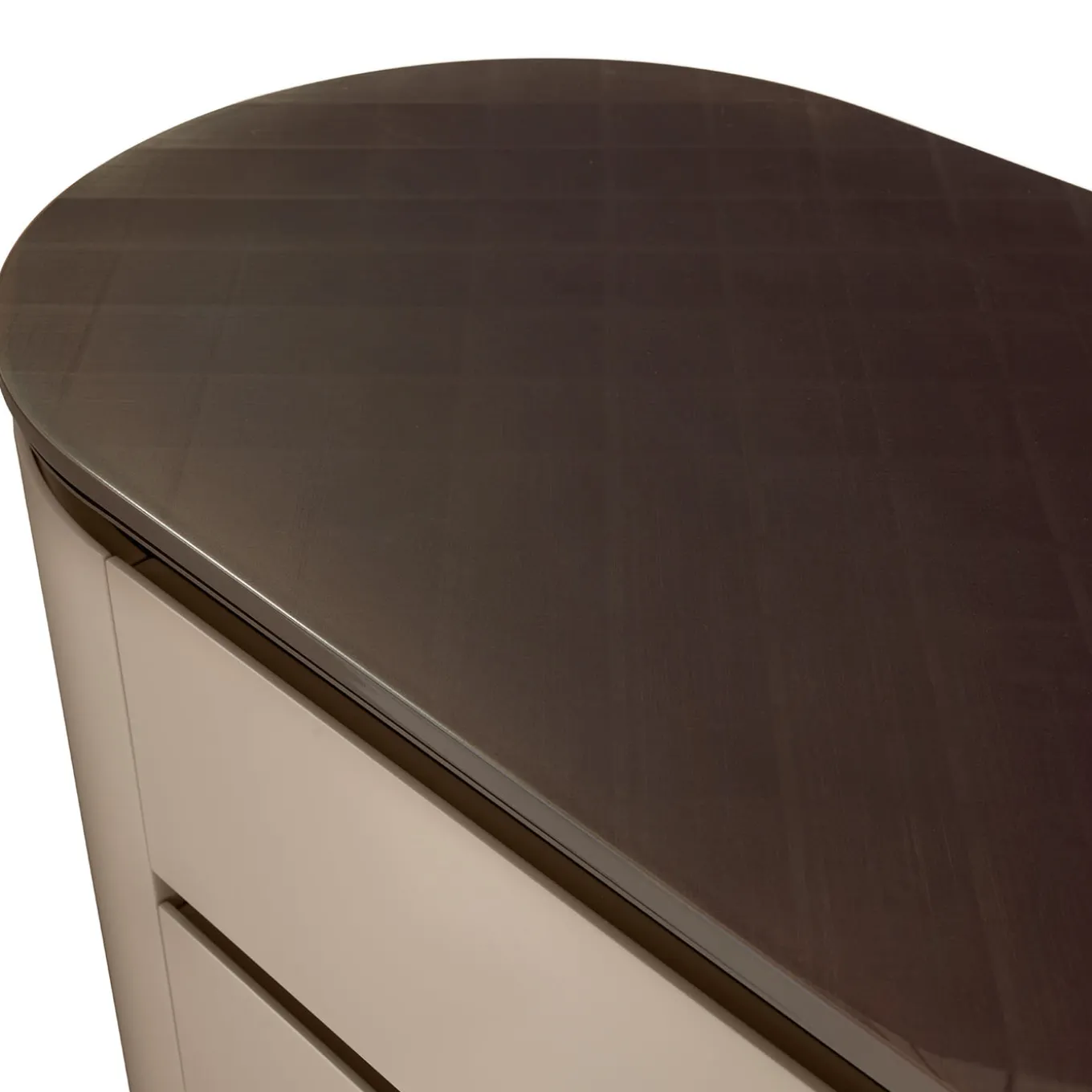 Elegance takes center stage in this dresser, characterized by its gentle curves and expert craftsmanship. The rounded silhouette, meticulously crafted from plywood and MDF, boasts a sophisticated Warm Grey lacquer with a matte sheen. The top in Biotite with a brushed lacquer with a high-gloss finish completes the piece. The three drawers feature a soft-closing system. Unlock bespoke options – including material and lacquer – tailored to your preferences by contacting our Concierge.