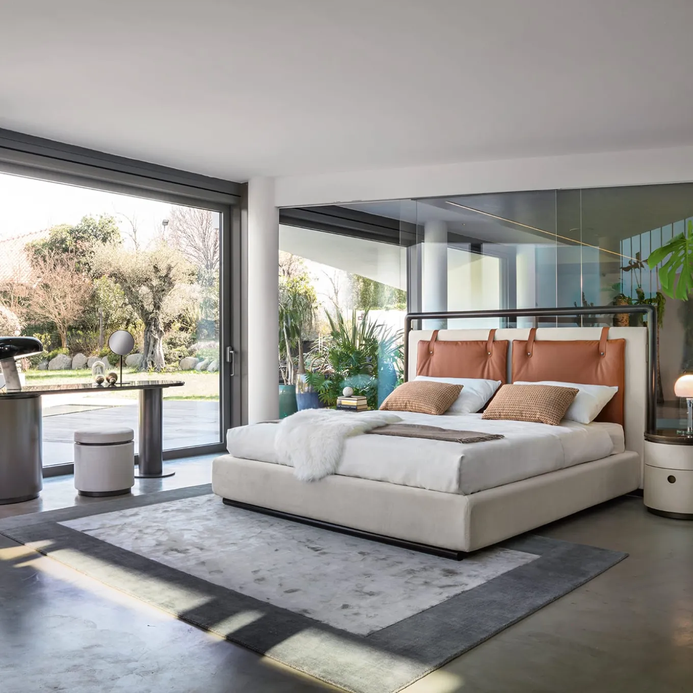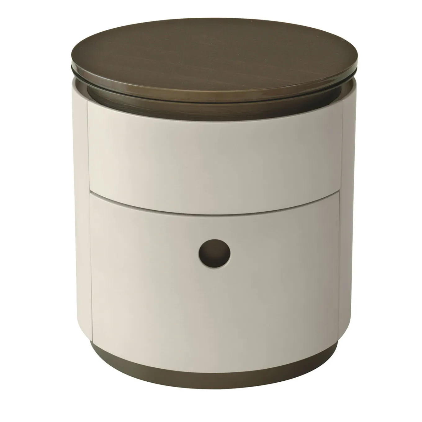 A sleek and distinctive design from the Loop series, this night table is characterized by a simple cylindrical shape, deftly crafted and finished into an ergonomic complement of timeless flair. Fashioned of curved plywood and MDF, the structure is finished with a pearl champagne polyester lacquer, elegantly contrasting with the brushed bronze-finished metal top and satin bronze details. Completed with two soft closing drawers, it is available with a marble top and in other colors.