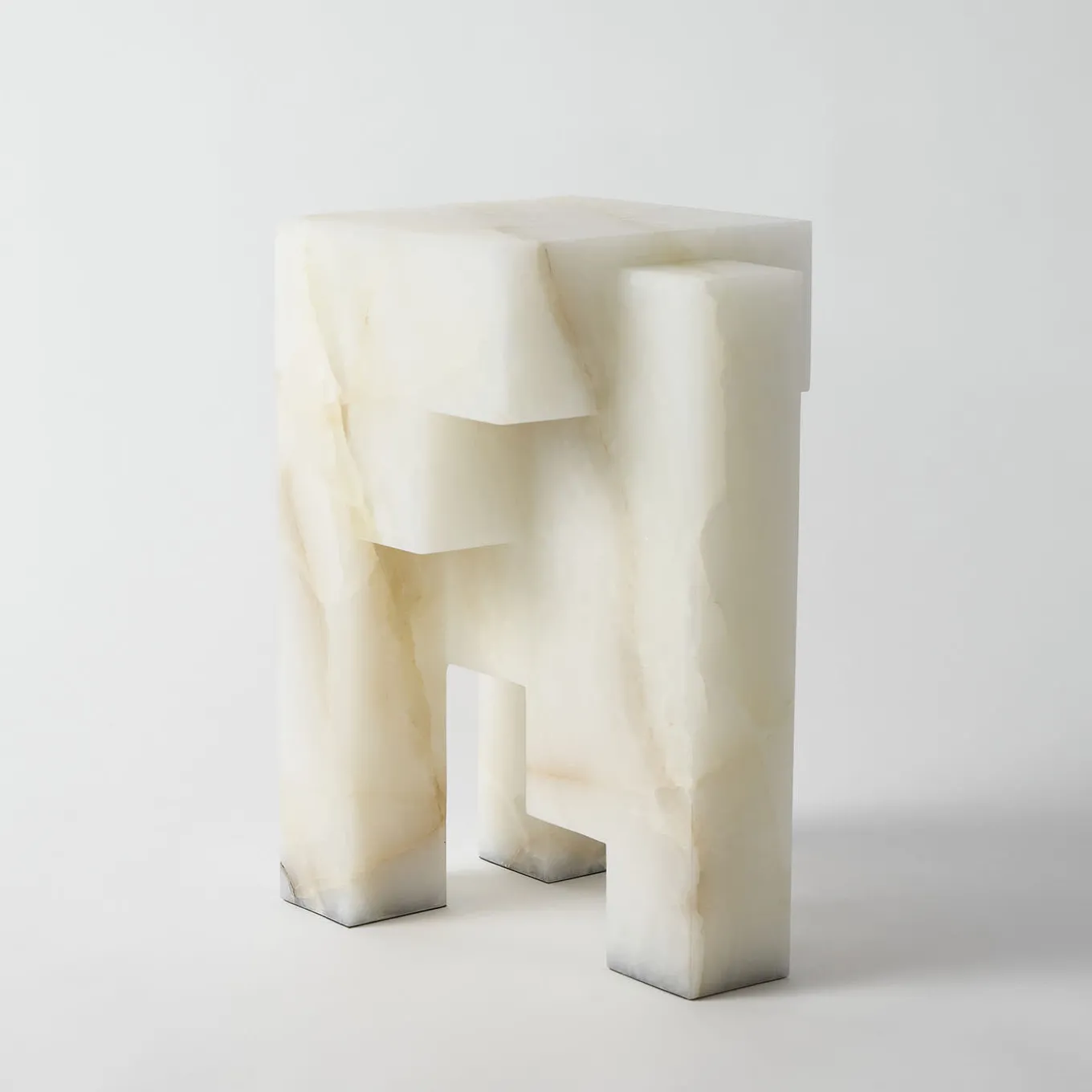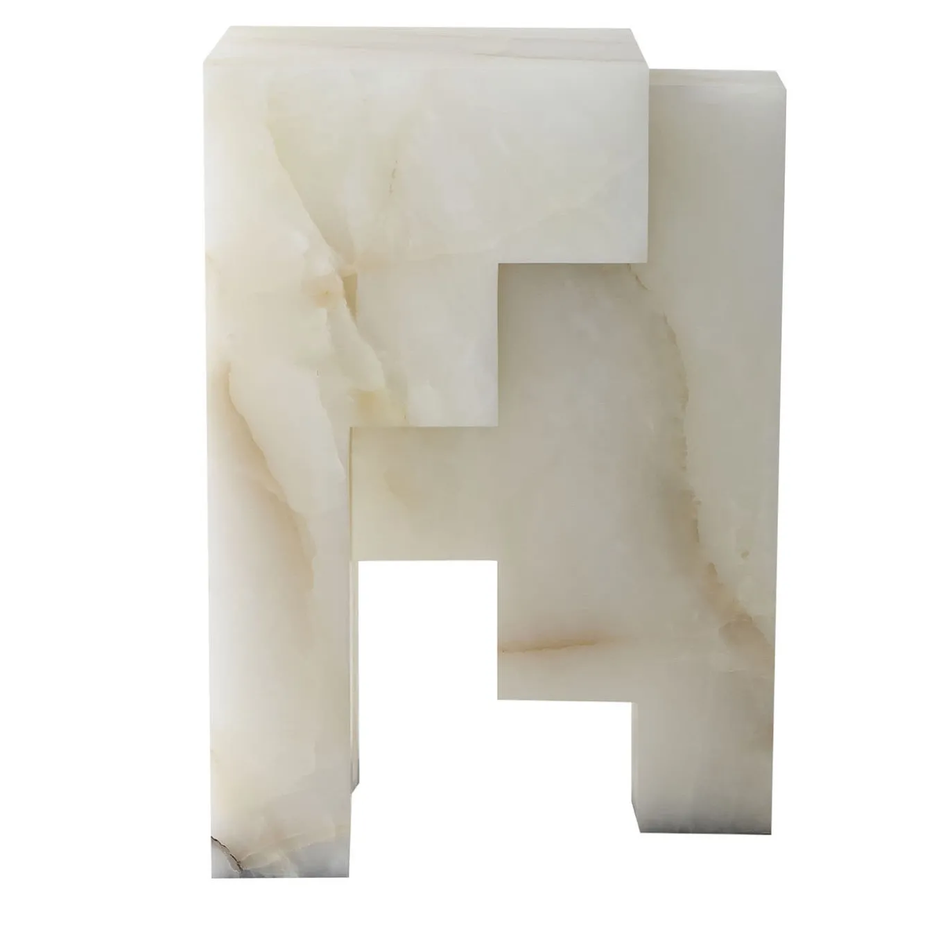 Crafted from stunning white onyx, the Los Tres Deseos Side Table serves a dual purpose as both a stool and a side table. This piece exemplifies meticulous craftsmanship and innovative design, drawing inspiration from contemporary aesthetics. Its sculptural form emphasizes a bold graphic presence, elevating any interior space with its strikingly elegant silhouette. Highlighted by the inherent beauty of the material, this side table is designed to showcase the unique characteristics of white onyx, ensuring each piece stands out in its own right. The design encapsulates a refined blend of functionality and artistry, making it an exceptional addition to a modern living environment.