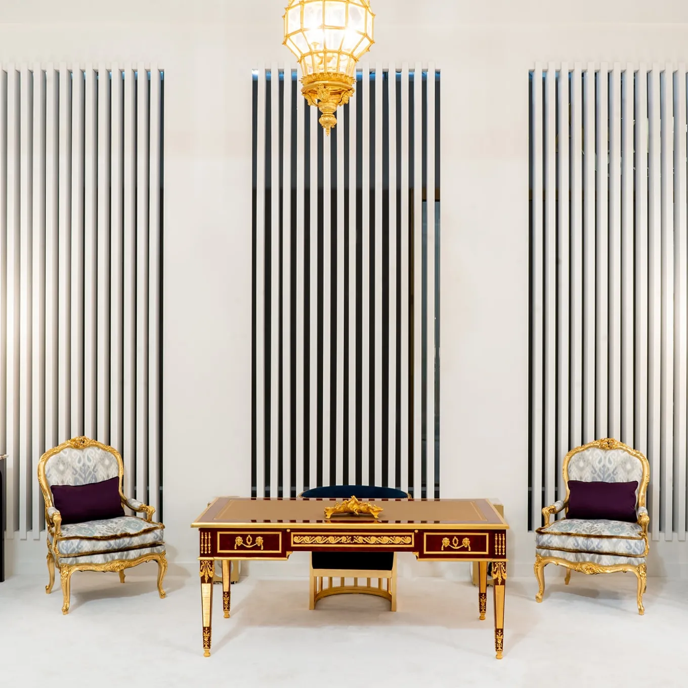 An exclusive Louis XVI-style design of extraordinary refinement, this writing desk will imbue a luxurious allure in a sophisticated interior. Handcrafted of Pomele Mahogany, it is enriched with bronze decorations plated with 24K gold. The top is covered with precious leather enhanced with gold leaf engravings. This stunning design is completed with two small pull-out drawers for storing valuables and precious knick-knacks.