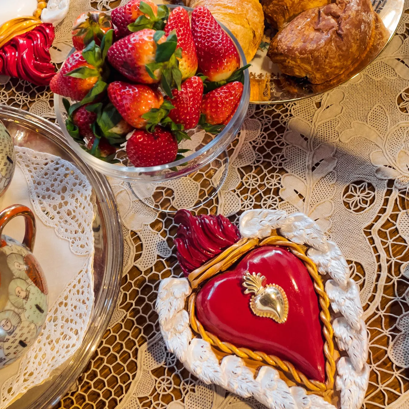 A superb display piece ideally paired with other pieces from the same refined series, this gorgeous ceramic heart features a fiery and passionate charm that will imbue any decor style with singular character. Handmade and hand-decorated, its cherry-red core is enriched with a polished gold heart and is surrounded by a string of golden threads and white feathery angel wings.