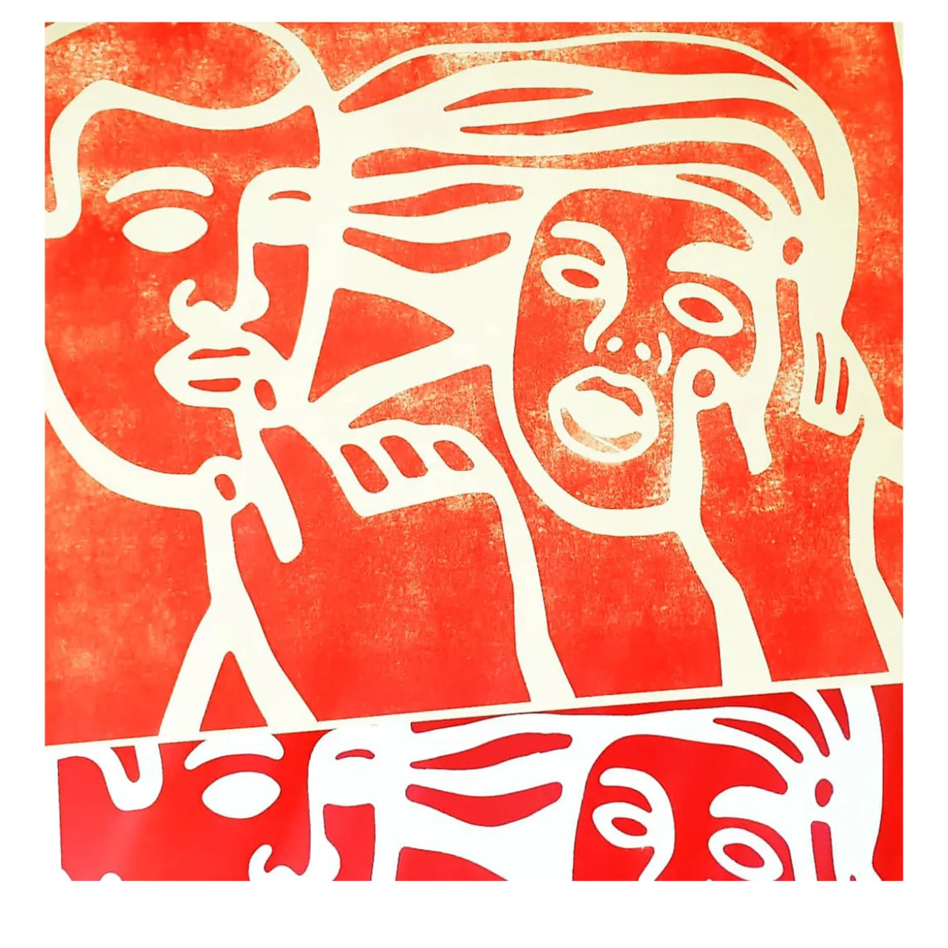 A marvelous work of art crafted taking advantage of the press printing technique, this print demands attention with its bold lines and rich contrasts. Silhouettes of a man and a woman emerge from the red backdrop, their features at once simplified and dramatized. The print belongs to a 2020 limited series of signed and numbered pieces in collaboration with Bonvini 1909.