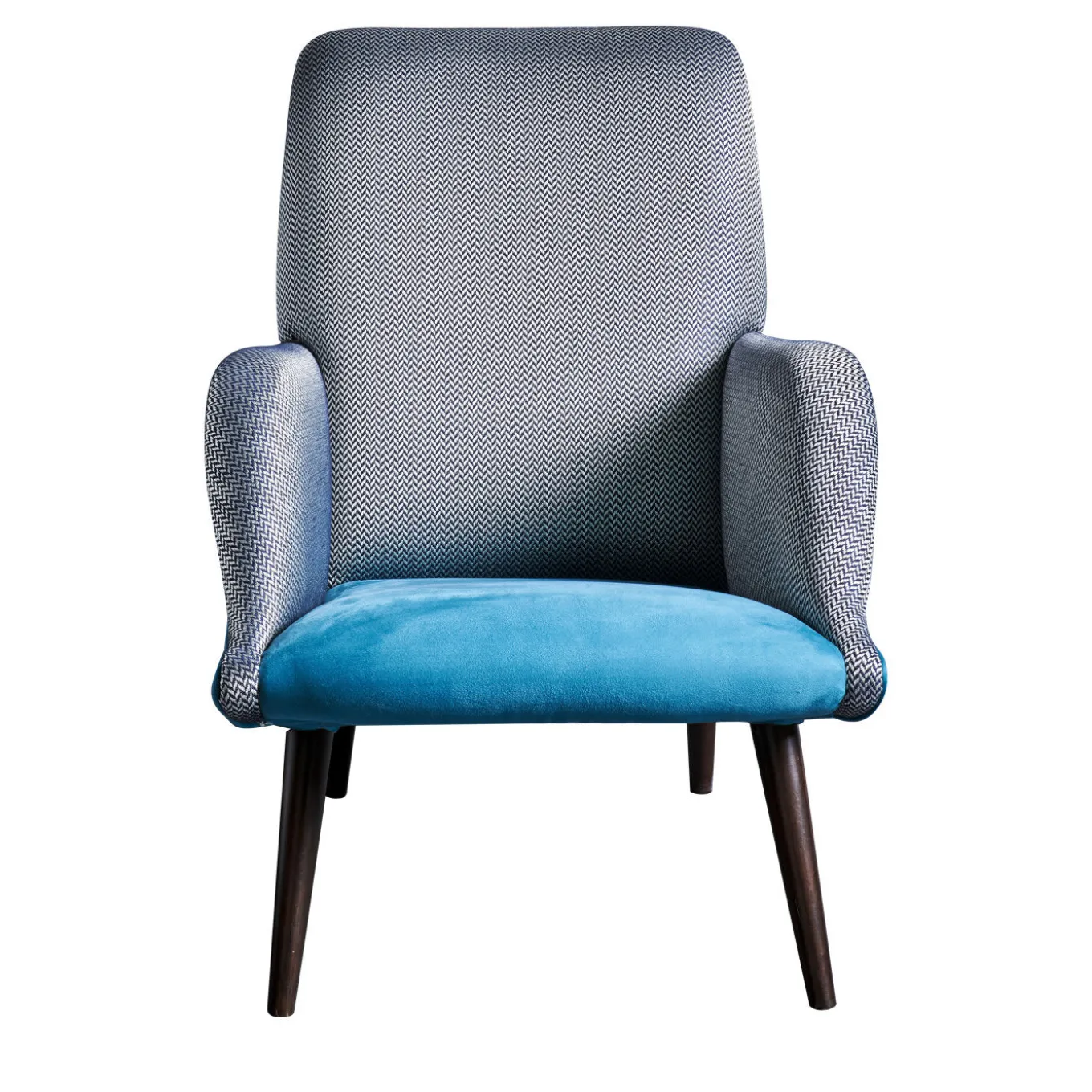 The arms and back of this sleek, cozy armchair are covered in herringbone fabric which stands in contrast to its bright turquoise seat, for an effect that is classic, bold and modern. Its wooden legs have a dark walnut finish. The Chelini Firenze Collection brings together traditional Made-in-Italy craftsmanship with a contemporary design.
