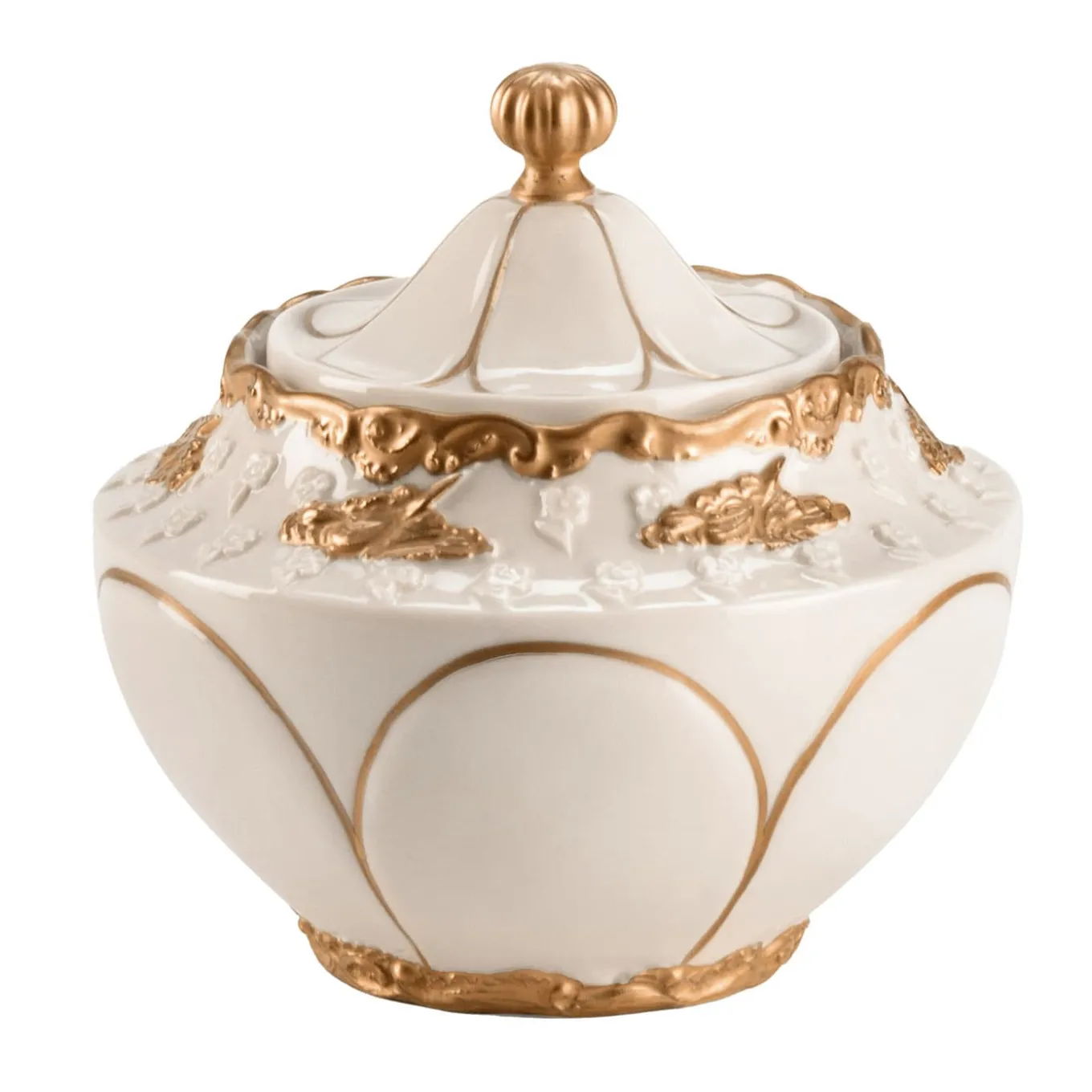 This superb piece is sure to enrich classic tableware collection with a dash of timeless refinement. Ornate detailing dots the concave profile of its bulging silhouette, details handpainted in pure gold just like the ornate rims, lid’s channeled finial, and petals-like lines. A raised pattern of tiny flowers accents the top for increased textural dynamism. Platinum version is also available.