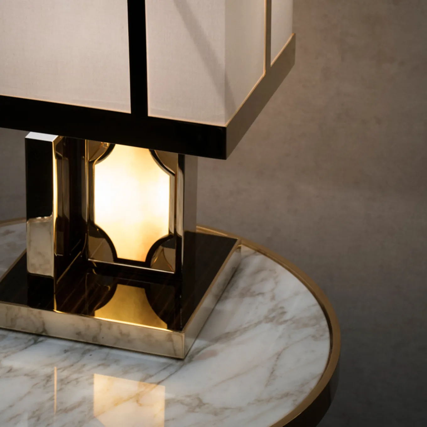 An intricate combination of refined materials, this eye-catching lamp will provide an alluring lighting in any room. The unique base is framed in gold-plated metal and is created by two rectangular elements in a T-shape setting atop a lacquered ebony square. The central element in translucent Onice miele with yellow-peach veining has a hexagonal design and is backlit to create a warm atmosphere and opulent visual appeal. The other lateral element is in lacquered ebony. The large, white lampshade is accented with a polished gold border and off-centered bands. The E27 bulb is not included.