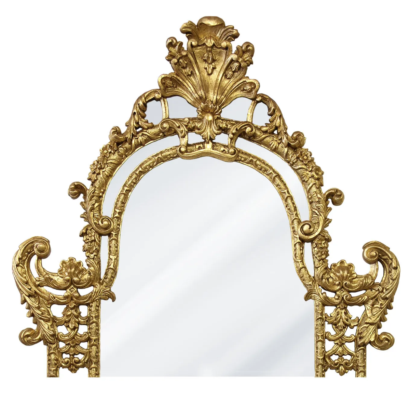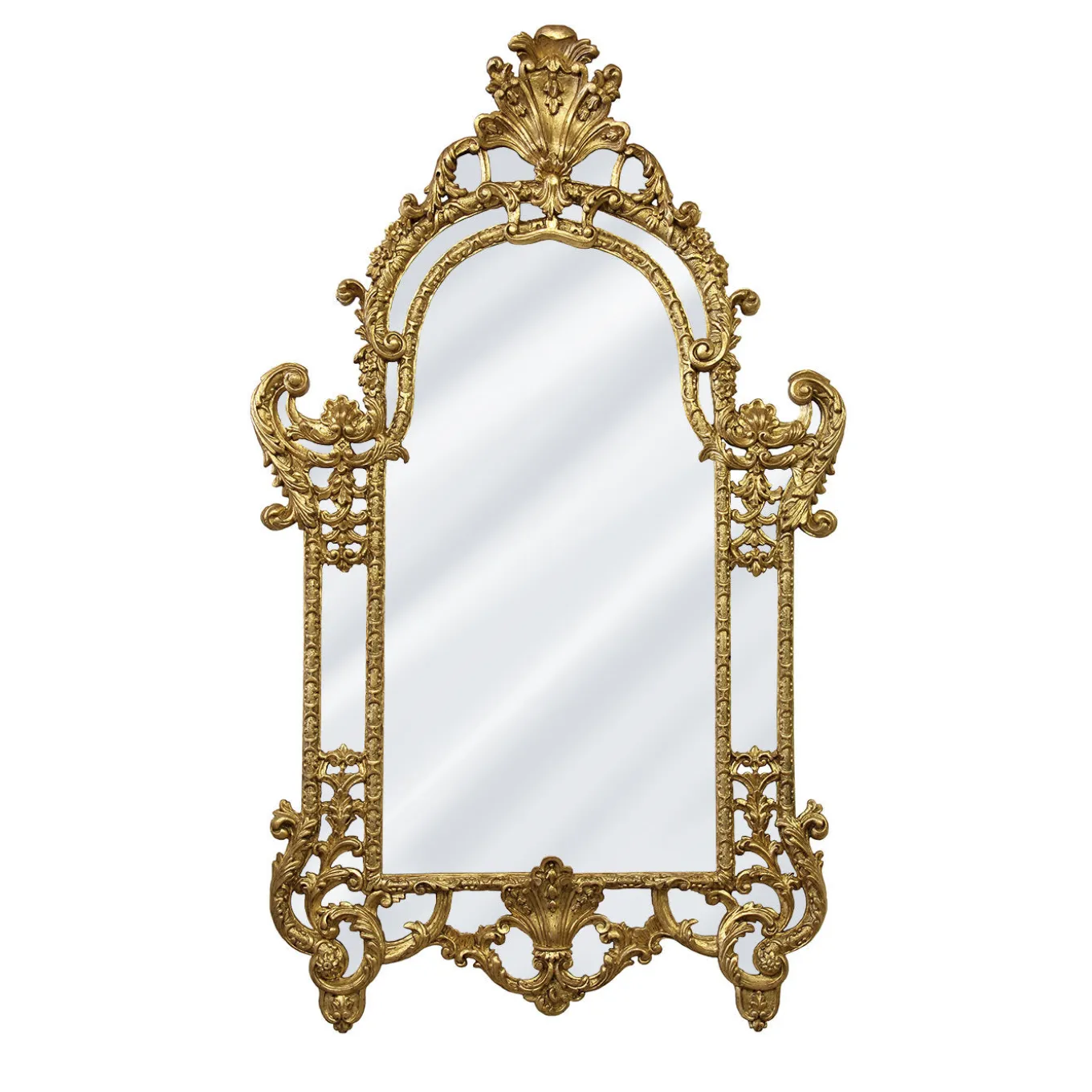 This magnificent frame was hand carved on antique wood. Every step in the crafting of this piece was done with ancient techniques known since the 14th century, from the preparation to the 22k pure gold gild using only natural materials, to the finishing and the final aging patina added. Part of an exclusive collection of only two pieces, this framed mirror will create an arresting effect in any environment it is placed.