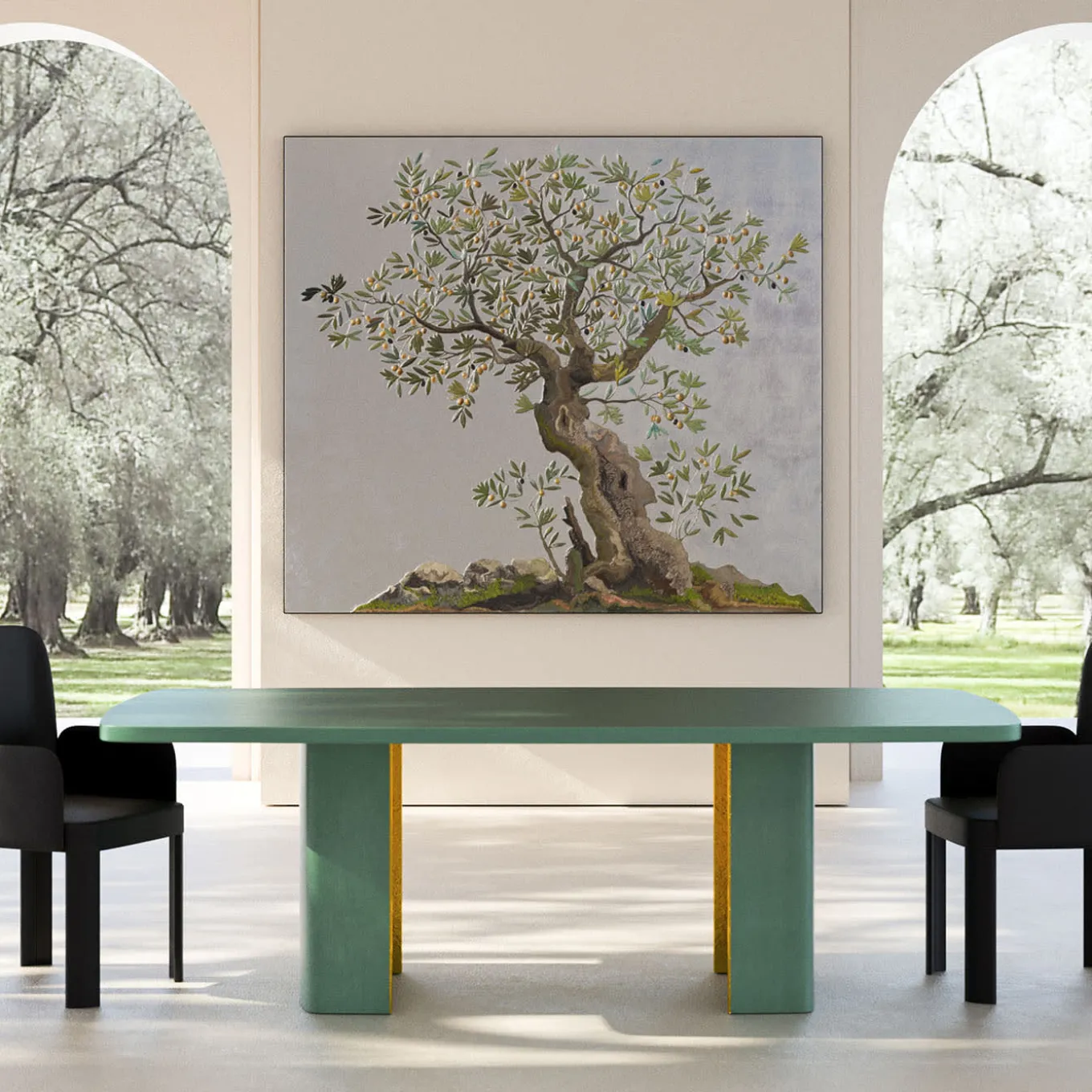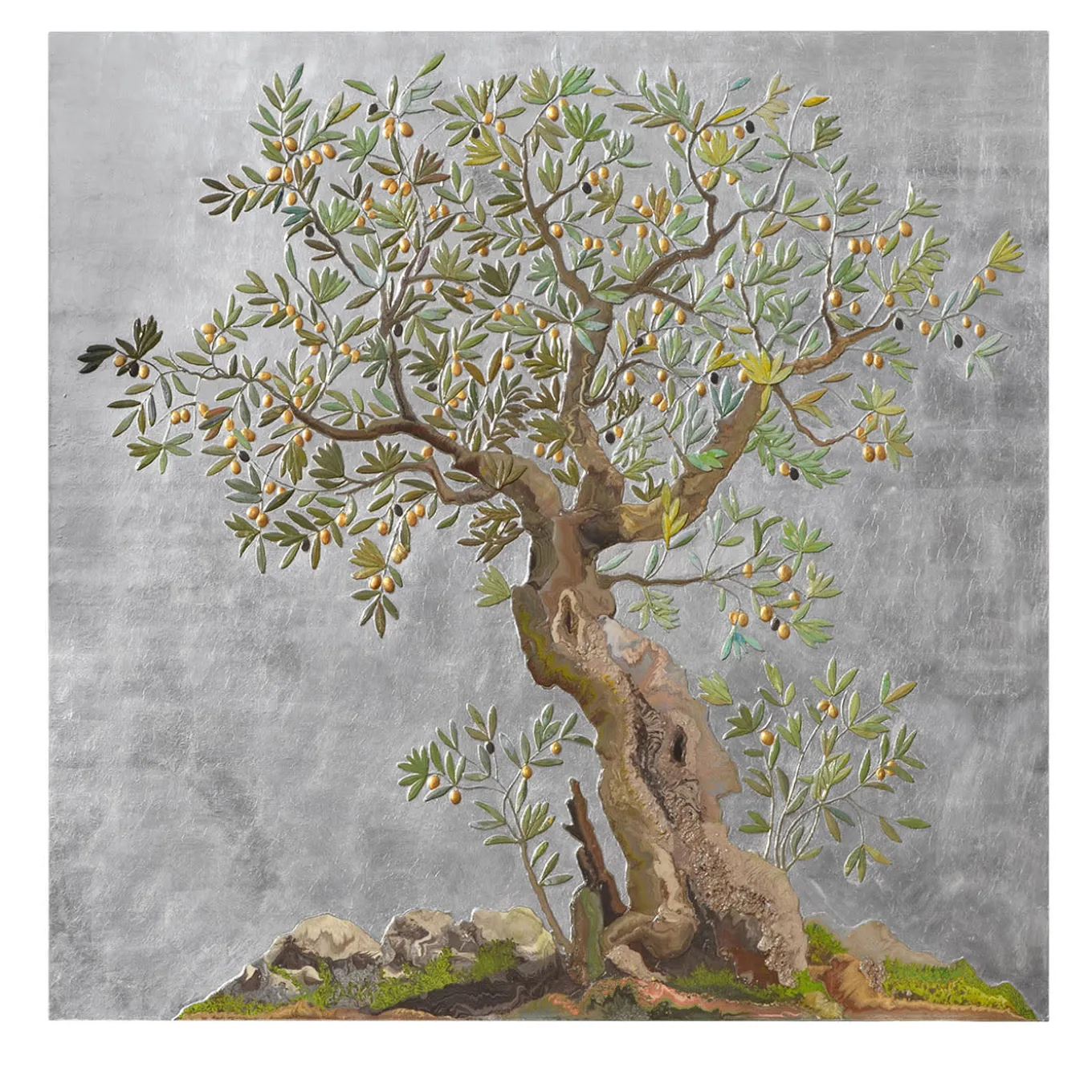 “L’Ulivo” is a stunning representation of nature’s beauty and symbolism. This piece draws inspiration from the artist’s deep connection with the olive tree, embodying strength and regeneration, reminiscent of ancestral groves observed daily. Crafted with meticulous attention to detail, the artwork features a textured depiction of the sturdy trunk and delicate leaves, all executed in scagliola, bringing each element to life. Golden reflections on the olives against a silver leaf background create a mesmerizing interplay of light, enhancing the piece’s allure. Designed for vertical spaces, this artwork serves as an elegant decorative element, perfect for enhancing sophisticated interiors. Its artisanal quality and timeless essence make it an exceptional choice for those seeking to enrich their surroundings with nature’s charm. Available in a limited edition, this piece celebrates Italian craftsmanship and the enduring beauty of the olive tree.