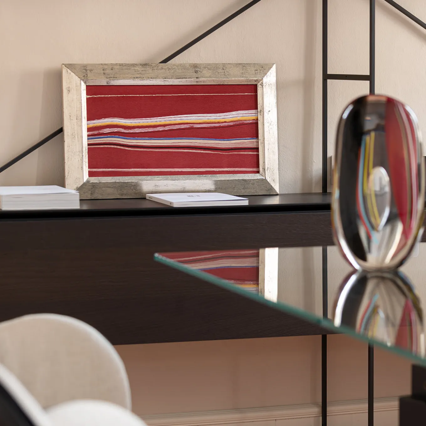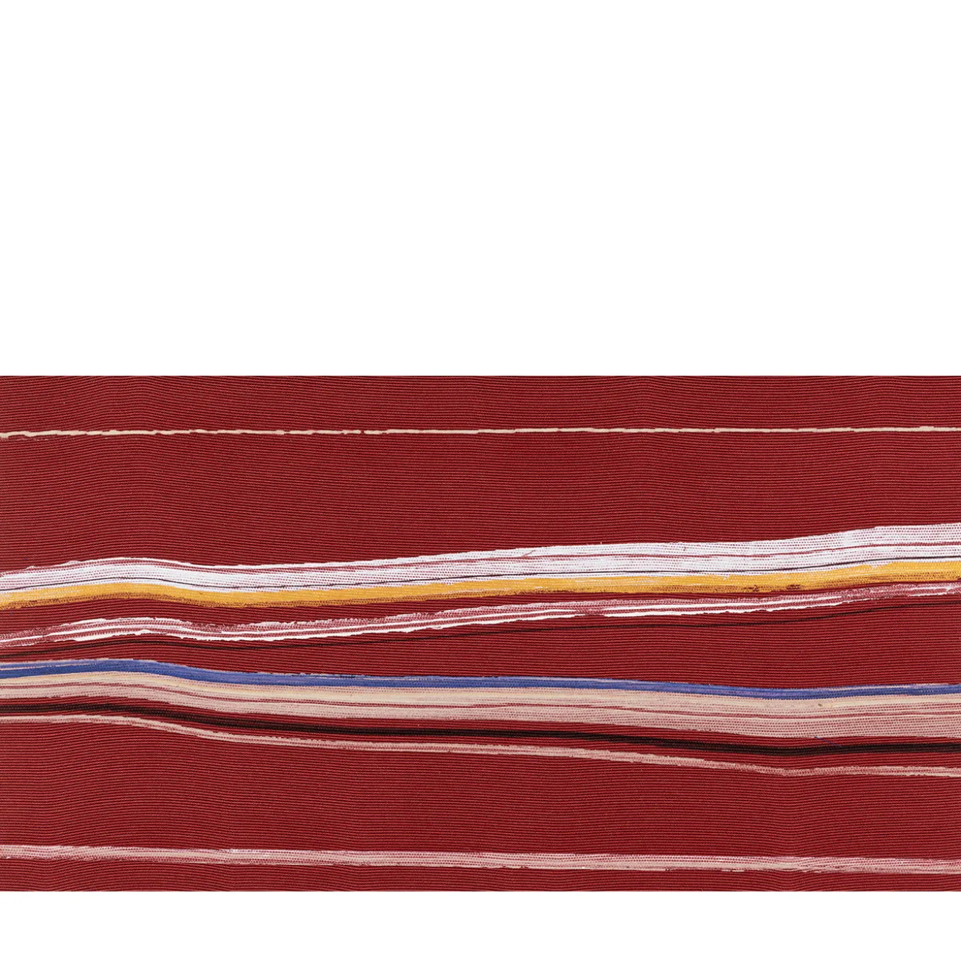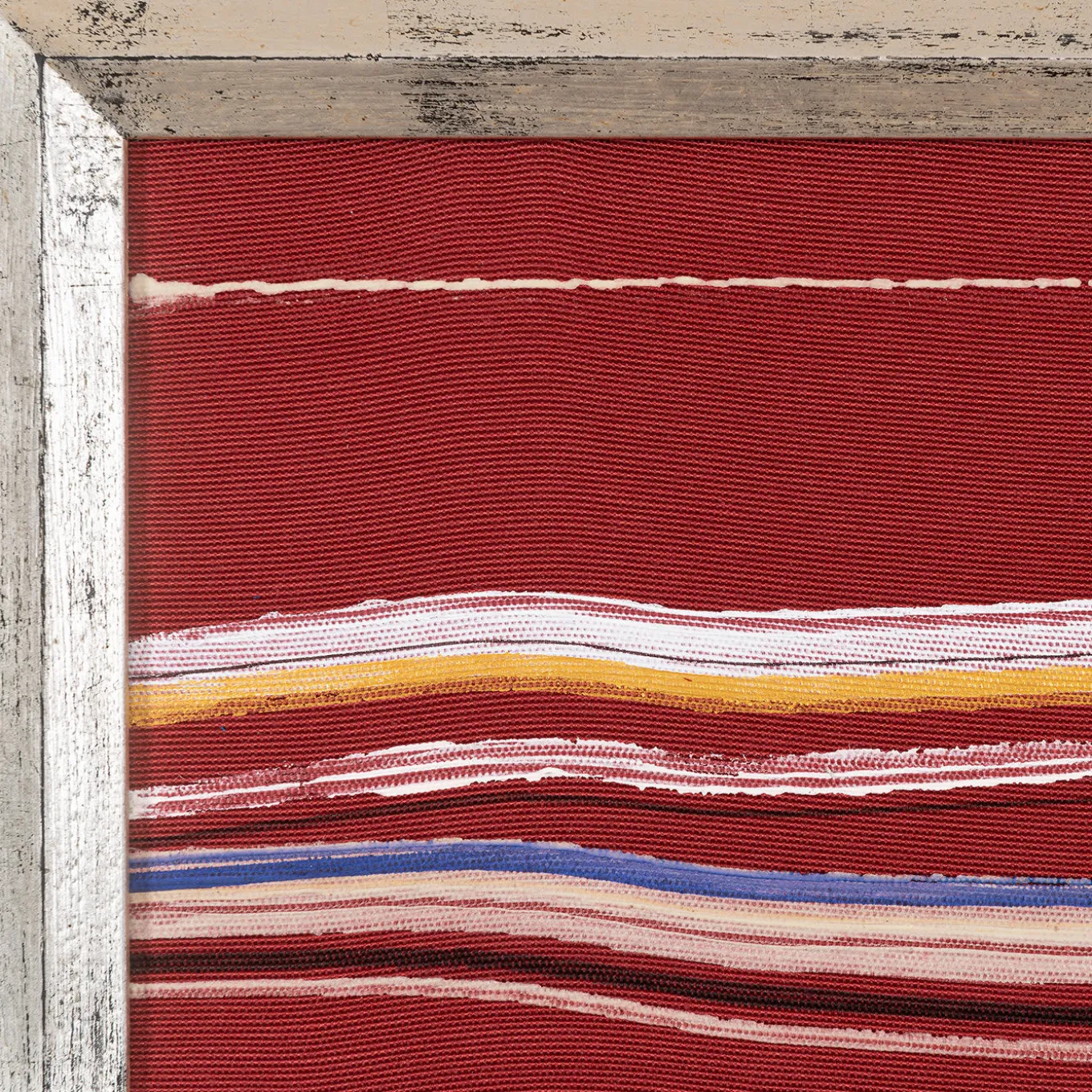 Vittore Frattini completed this piece in April 2020. Painted on canvas (33, 5 x 55cm frameless), the work showcases a red background interrupted by an irregular series of horizontal colored lines matching the light hue of the frame. Frattini used acrylic colors and Lumen, a blend of durable acrylic co-polymers that maintain the color for many years and even allow the colors to shine in the dark.