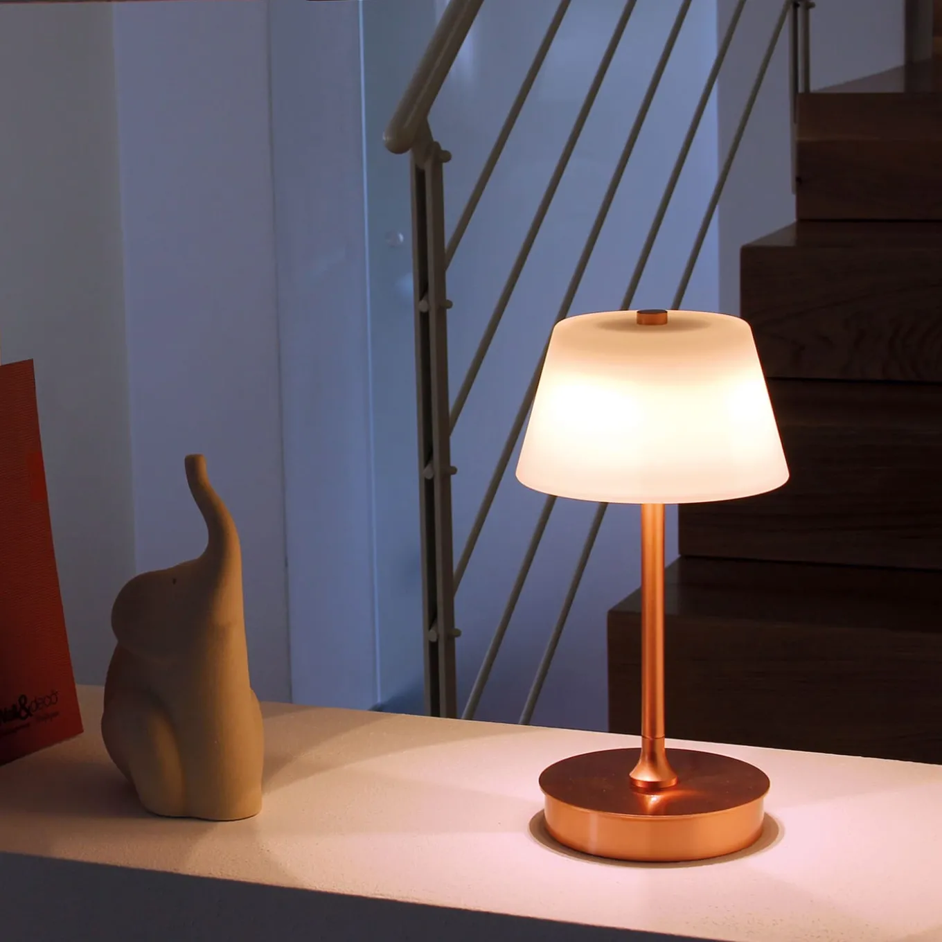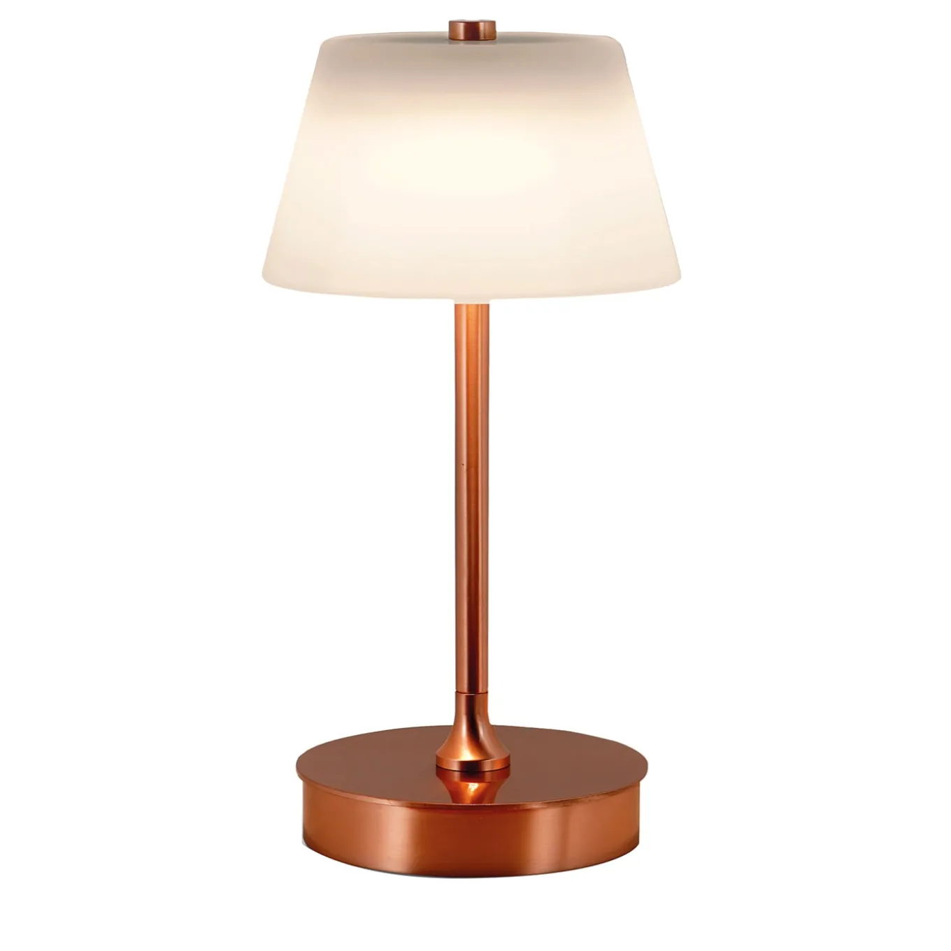 This elegant and timeless, rechargeable table lamp flaunts a minimalist and luminous copper-finished brass stem resting on a round base and topped with a minimalist satin glass shade. Versatile and practical due to its wireless design, light is emitted from three LED bulbs (1.2W, 100 – 240V, 80 CRI). Supplied with electric plug, it is equally apt to safely warm indoor and outdoor moments. Please ask the Concierge for additional information.