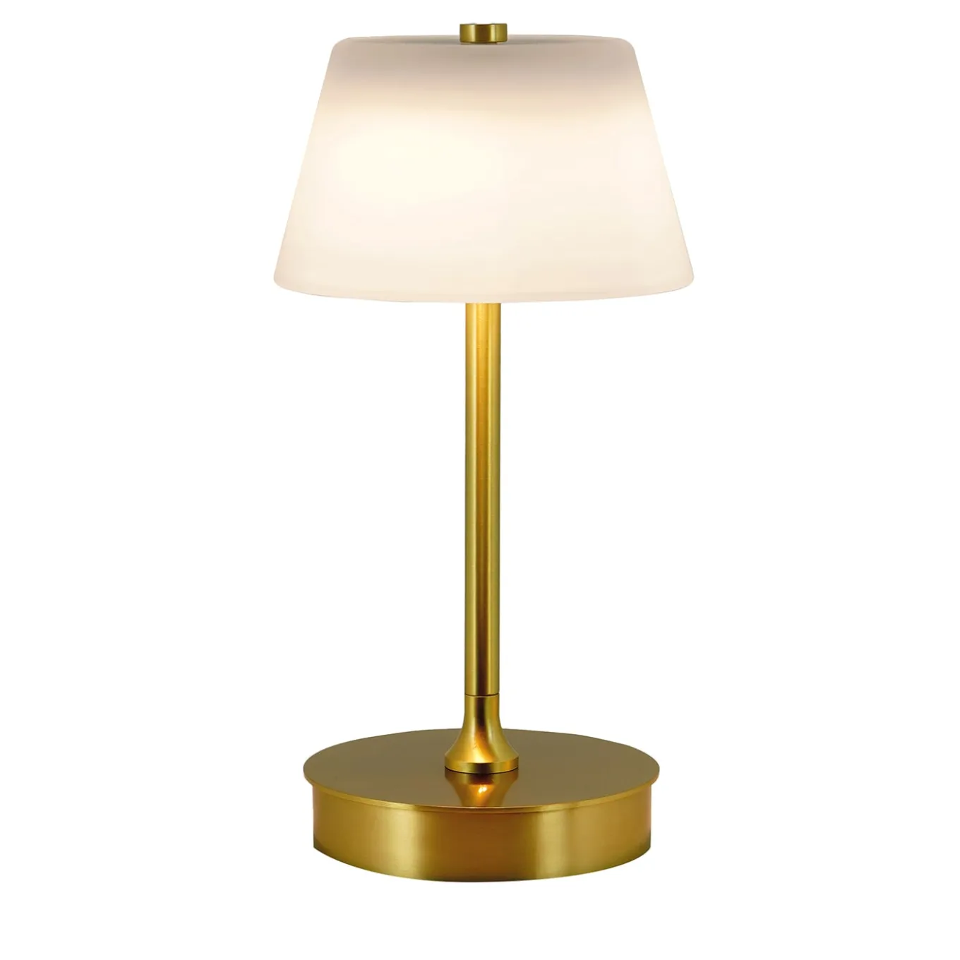This timeless and versatile, rechargeable table lamp features a clean and luminous satin brass stem resting on a round base and topped with a traditionally-shaped satin glass diffuser. Designed by Stefano Tabarin, light is emitted from three LED bulbs (1.2W, 100 – 240V, 80 CRI). Supplied with electric plug, it is suitable for both indoor and outdoor use, please inquire with the Concierge for more detailed information.