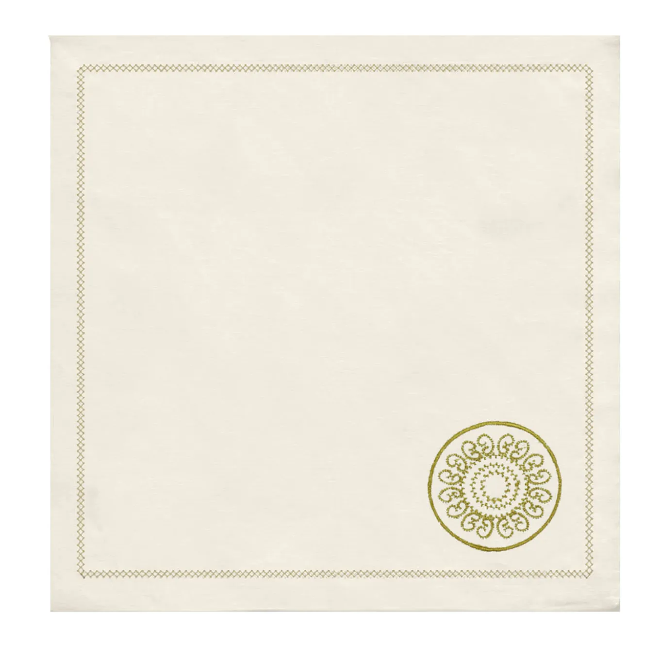 Reinterpreted with subtle refinement, elements from the spectacular and colorful light installations typically adorning Apulian town festivals inspired the minute Mako cotton embroidery of this two-napkin linen set. Long hours of scrupulous manual work are required for the embroideries to be precise, their golden tone adding a dash of luxury to the linen backdrop.