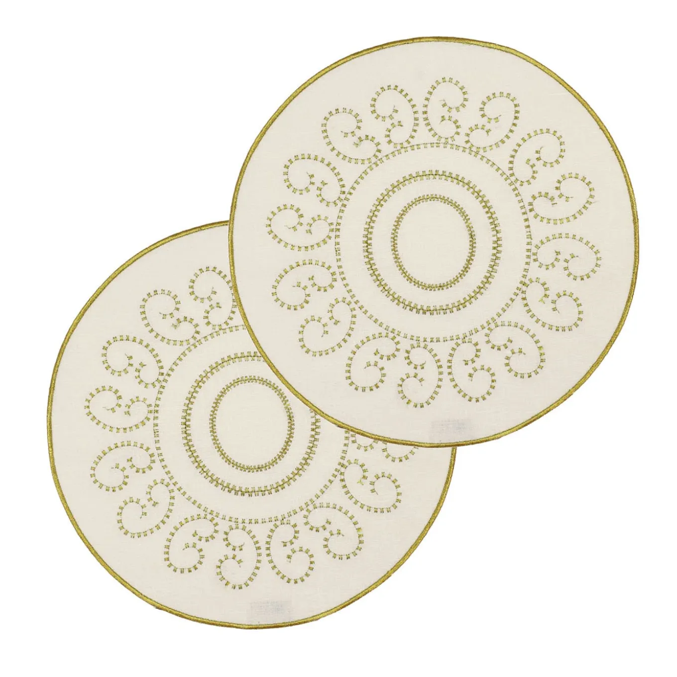 Embroidery mastery meets Apulian folklore in this sophisticated set of two round linen charger placemats. Minutely embroidered in golden Mako cotton, a radial motif of light installations crowding local town festivals characterizes each piece, a decoration resulting from the patient work of master embroiderers. Coordinated table linen from the Luminaria Collection are available in the Artemest catalog.