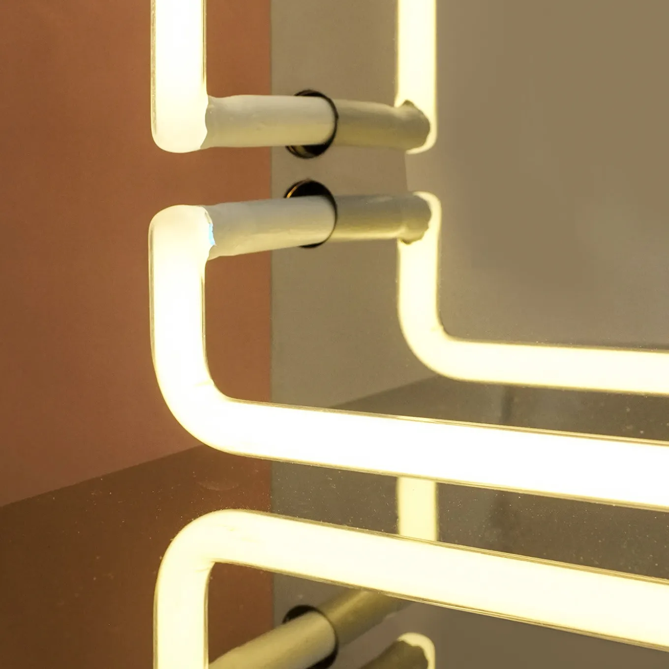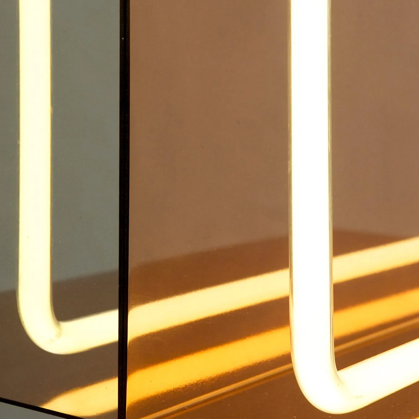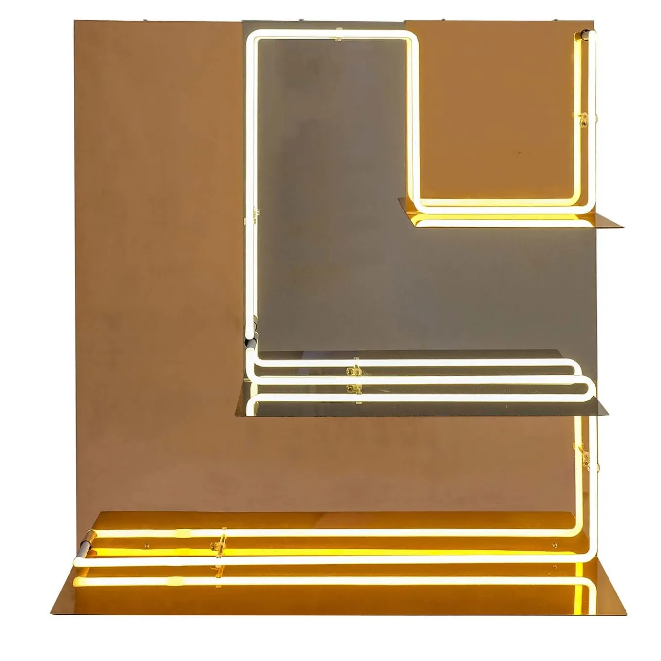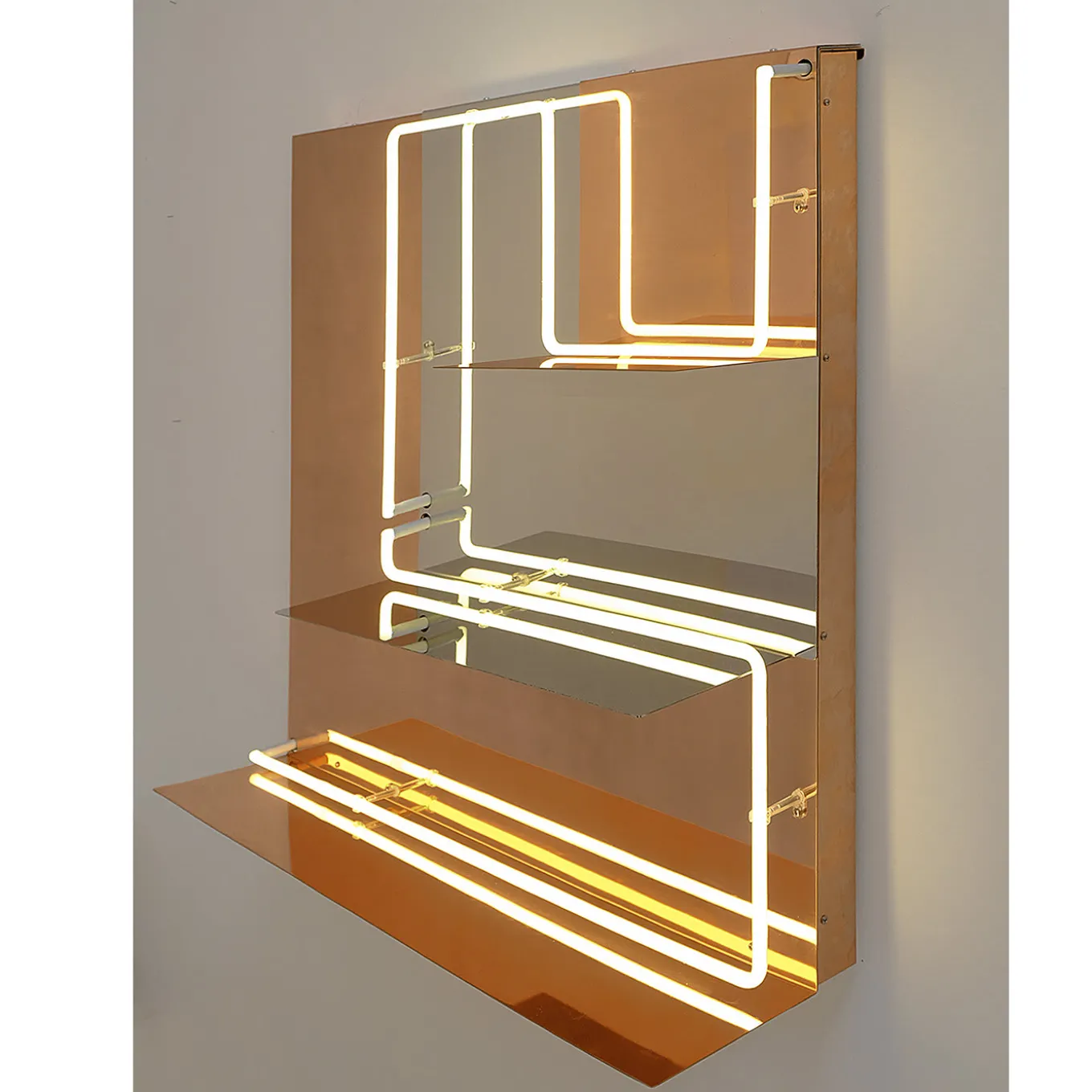 The fascinating Luminous Panel, designed by Paolo Giordano and Ouwen Mori in 2019, is part of a 7 piece Limited Edition project, featuring painted panels, shelves, mirrors and lighting tubes. Crafted from metal, this stunning piece offers a high level of style and innovation to any modern living space and plays with a combination of gray and orange colors.