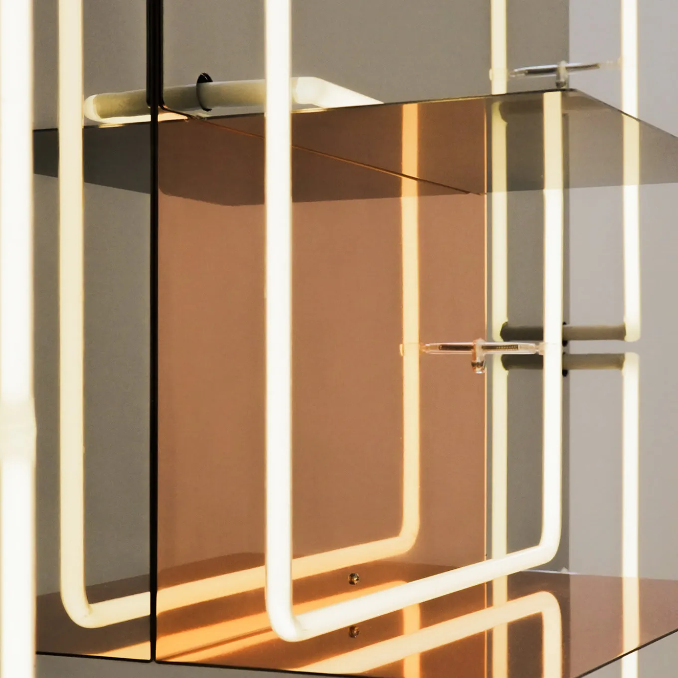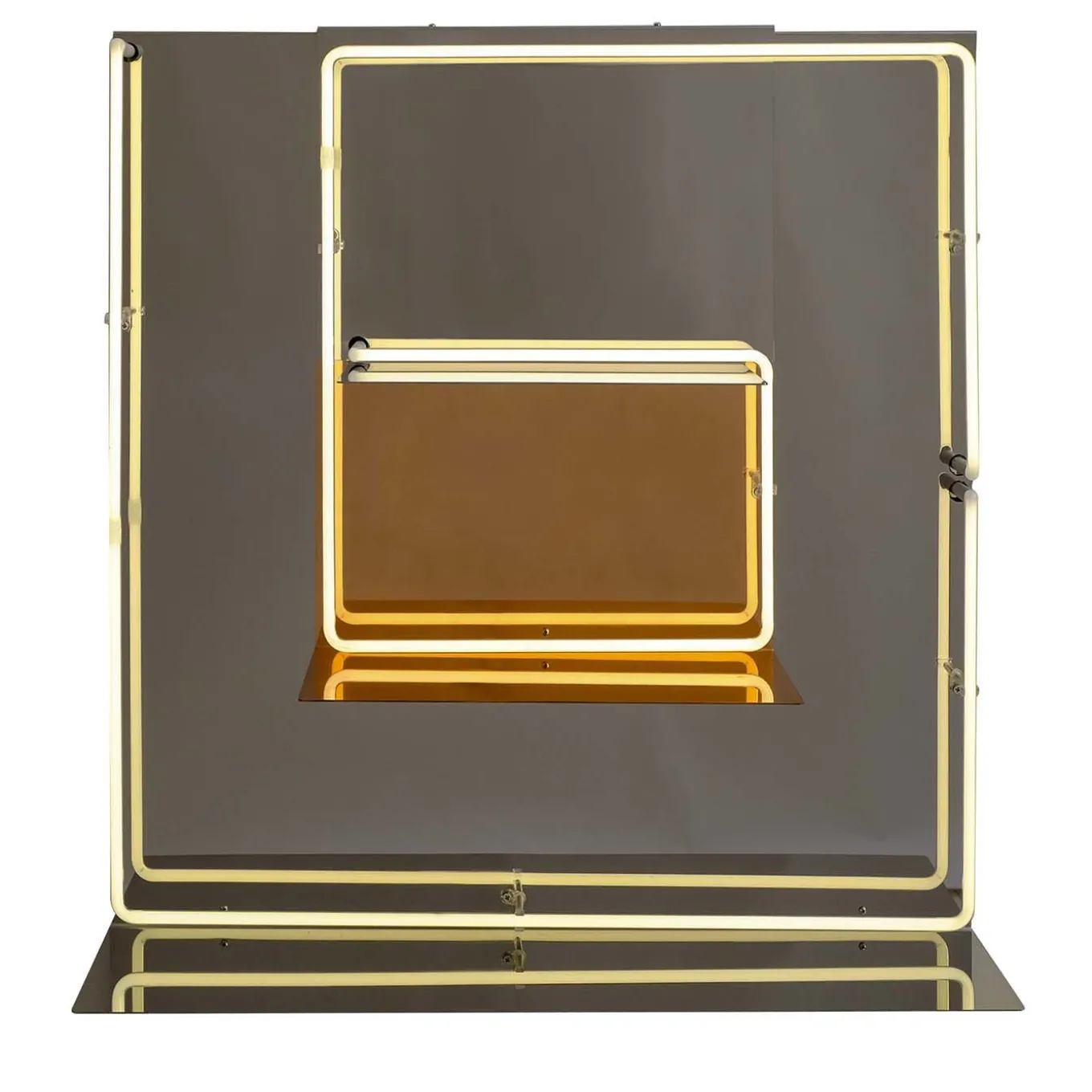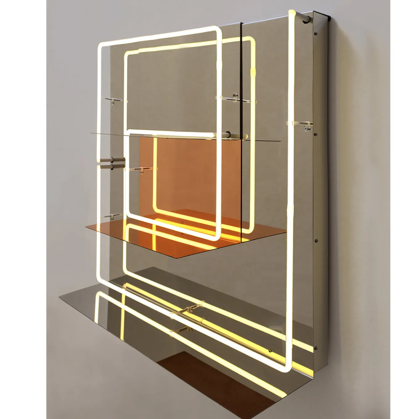 Part of a 7 piece Limited Edition project, the fascinating Luminous Panel, designed by Paolo Giordano and Ouwen Mori in 2019, is crafted from metal and features painted panels, shelves, mirrors and lighting tubes. Painted in a combination of gray and orange, this stunning piece offers a high level of style and innovation to any modern living space.